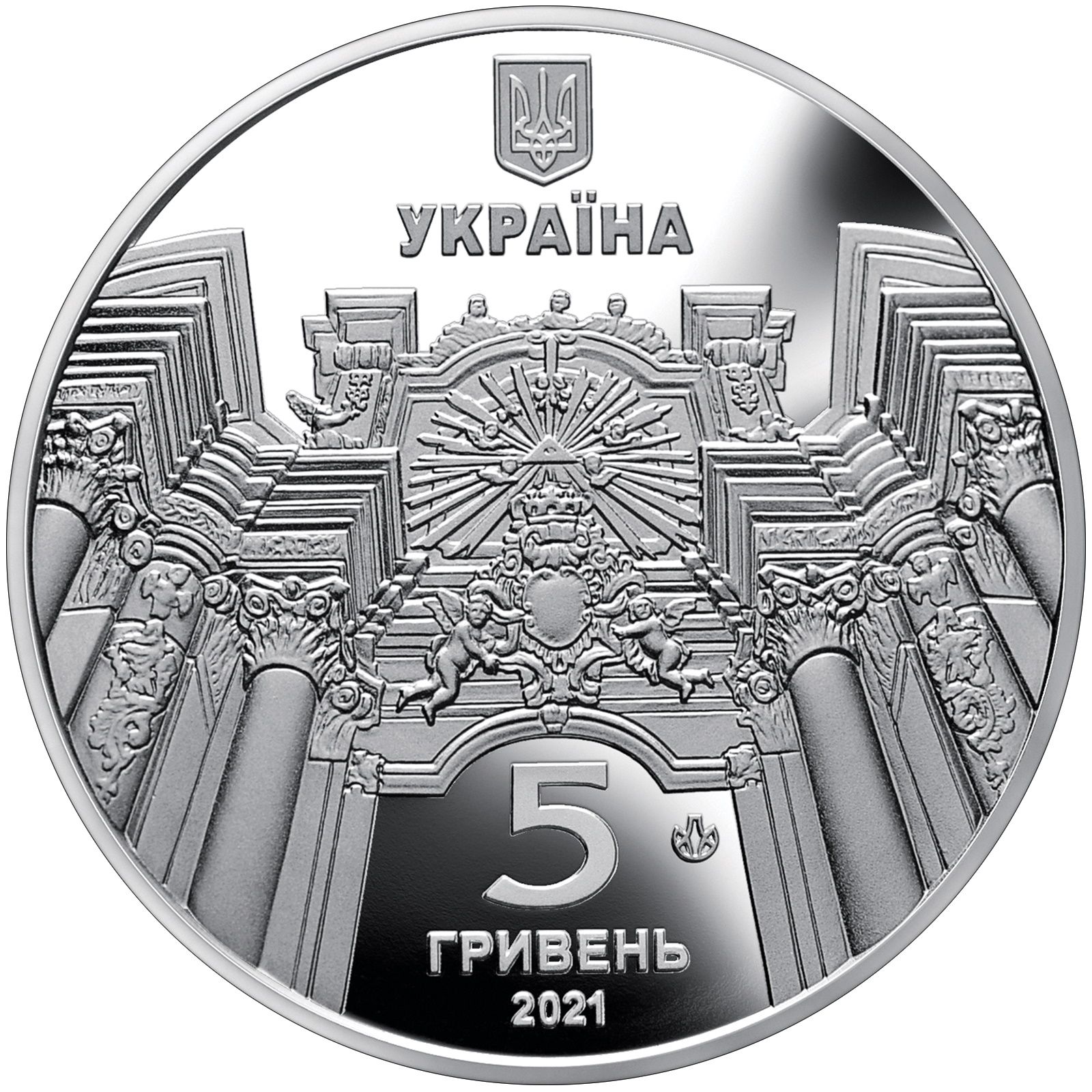 Опис: На монеті зображено малий герб України, під яким розміщено напис «УКРАЇНА»; також зображено фрагмент центрального нефа церкви; нижче, на гладкому тлі, вказано номінал монети та рік випуску – 5/ГРИВЕНЬ/2021 (5/гривень/2021); нижче, праворуч, розміщено знак монетного двору Дrukárно-монетного двору НБУ.