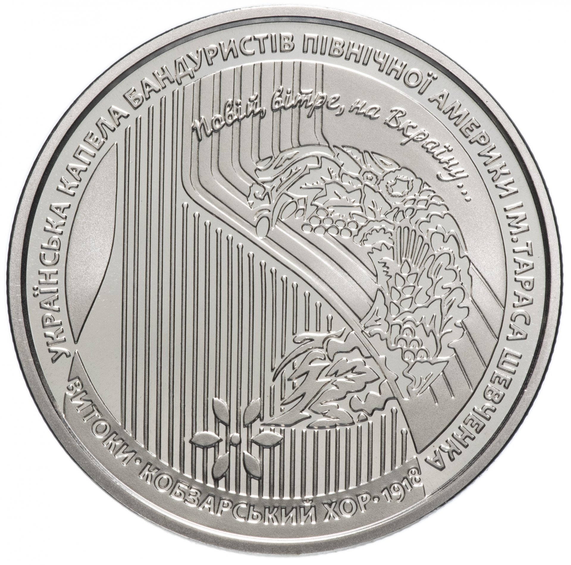 Опис: У верхній частині на гладкому тлі розміщено напис «УКРАЇНА», під яким зображено малий герб України, по обидва боки якого вказано роки 1918 та 2018; на рельєфному тлі розміщено номінал монети «5 ГРИВЕНЬ» (п’ять гривень), під яким зображено сім бандур у стилізованому виконанні на тлі квіткового візерунка; по колу розміщено напис ВИТОКИ • КОБЗАРСЬКИЙ ХОР (угорі); НАЦІОНАЛЬНА ЗАСЛУЖЕНА КАПЕЛА БАНДУРИСТІВ УКРАЇНИ ІМ. Г. І. МАЙБОРОДИ; (походження, хор кобзарів (вгорі), Національний заслужений хор бандуристів України імені Григорія Майбороди (зліва)).