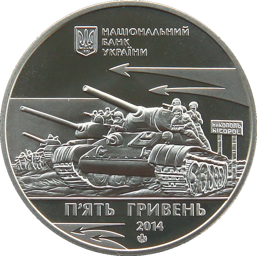 Опис: Малий герб України з написом НАЦІОНАЛЬНИЙ / БАНК / УКРАЇНИ (Національний / Банк / України); у центрі — динамічна композиція, що зображає наступ за участю танкових підрозділів; нижче — номінал монети П'ЯТЬ ГРИВЕНЬ (п'ять гривень) із зазначенням року випуску монети 2014 та знаком Монетного двору Національного банку України під ним.