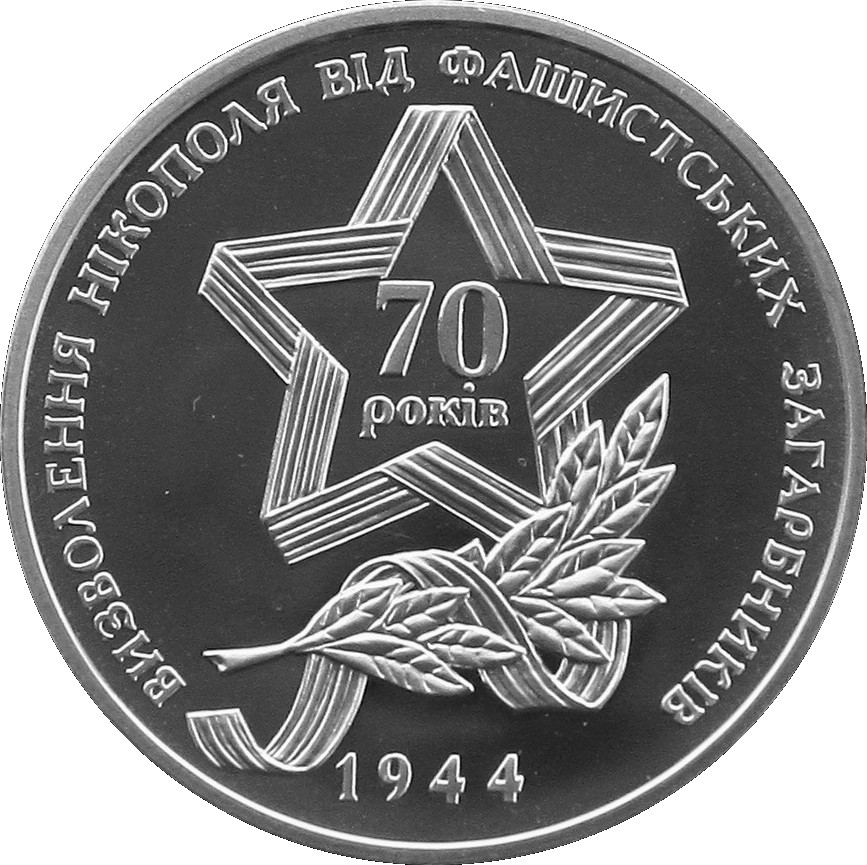 Опис: На реверсі на дзеркальному тлі зображено композицію: зірку у формі стрічки з написом 70/років (70/років) та лаврову гілку; також є напис ВИЗВОЛЕННЯ НІКОПОЛЯ ВІД ФАШИСТСЬКИХ ЗАГАРБНИКІВ (Звільнення Нікополя від фашистських загарбників) та напис 1944 (внизу).