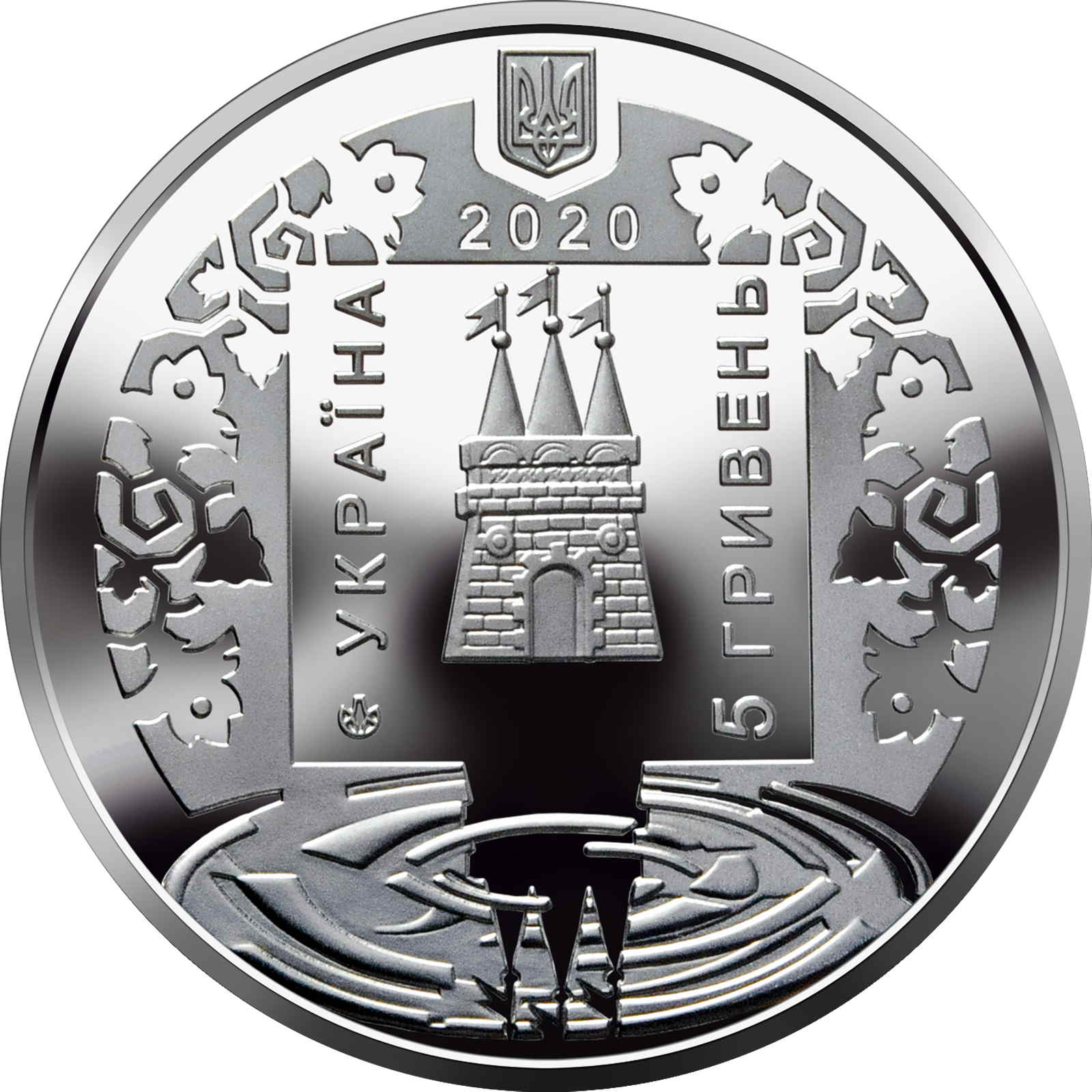 Опис: Зверху зображено малий герб України, під яким вказано рік випуску монети — 2020; у квадраті на гладкому тлі зображено герб міста, відбитий у воді, та вертикальні написи «УКРАЇНА» (ліворуч від герба) і номінал «5 ГРИВЕНЬ» (праворуч від герба); навколо квадрата — декоративний орнамент; також є знак монетного двору НБУ «Банкнотно-монетний двір НБУ» (під написом «УКРАЇНА»).