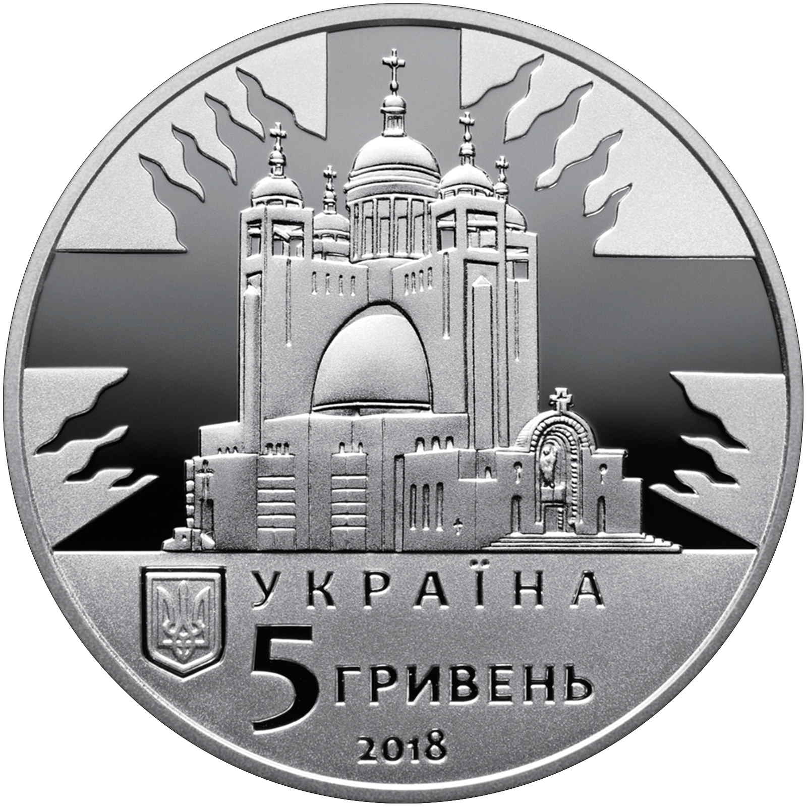 Опис: На гладкому тлі у вигляді стилізованих хрестоподібних балок зображено Патріарший собор Воскресіння Христового (у місті Києві); нижче — малий герб України, праворуч від якого — напис «УКРАЇНА», рік випуску монети — 2018 та номінал — 5 ГРИВЕНЬ.