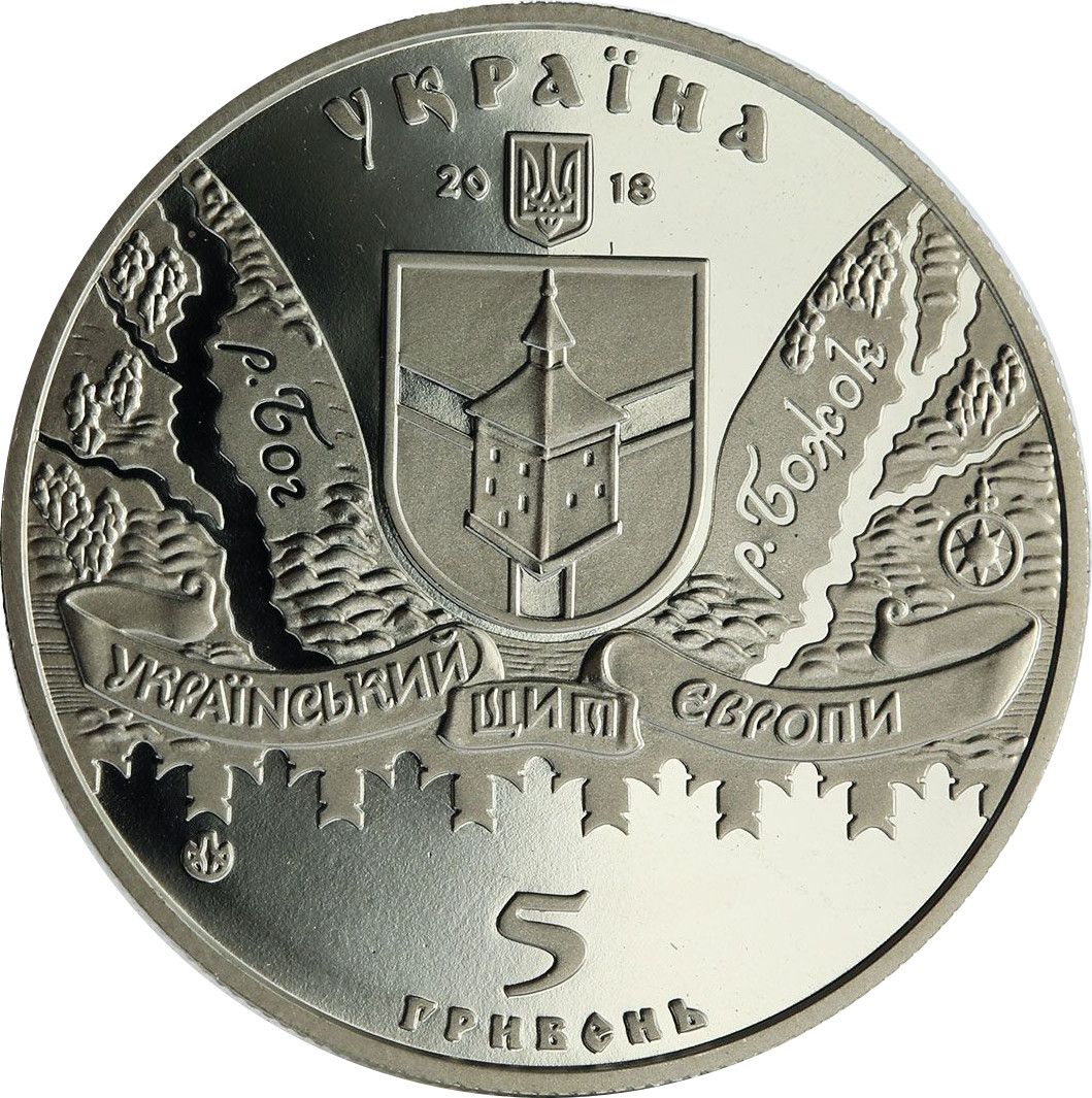 Опис: Зверху розміщено напис УКРАЇНА (Україна), під яким зображено малий герб України; по обидва боки герба розміщено цифри 20 і 18; у центрі розміщено такий композиційний елемент: щит із зображенням вежі, по обидва боки якої розміщено стилізовану карту місцевості з написами р. Бог (річка Бог) (зліва) та р. Божок (річка Божок) (праворуч) – стародавні назви річок; нижче композиції – стрічка з написом УКРАЇНСЬКИЙ ЩИТ ЄВРОПИ (Український щит Європи); нижче, на тлі зубців, – номінал монети 5/ГРИВЕНЬ (5/гривень); ліворуч – знак монетного двору ПБЖ «Банкнотно-монетний двір НБУ».