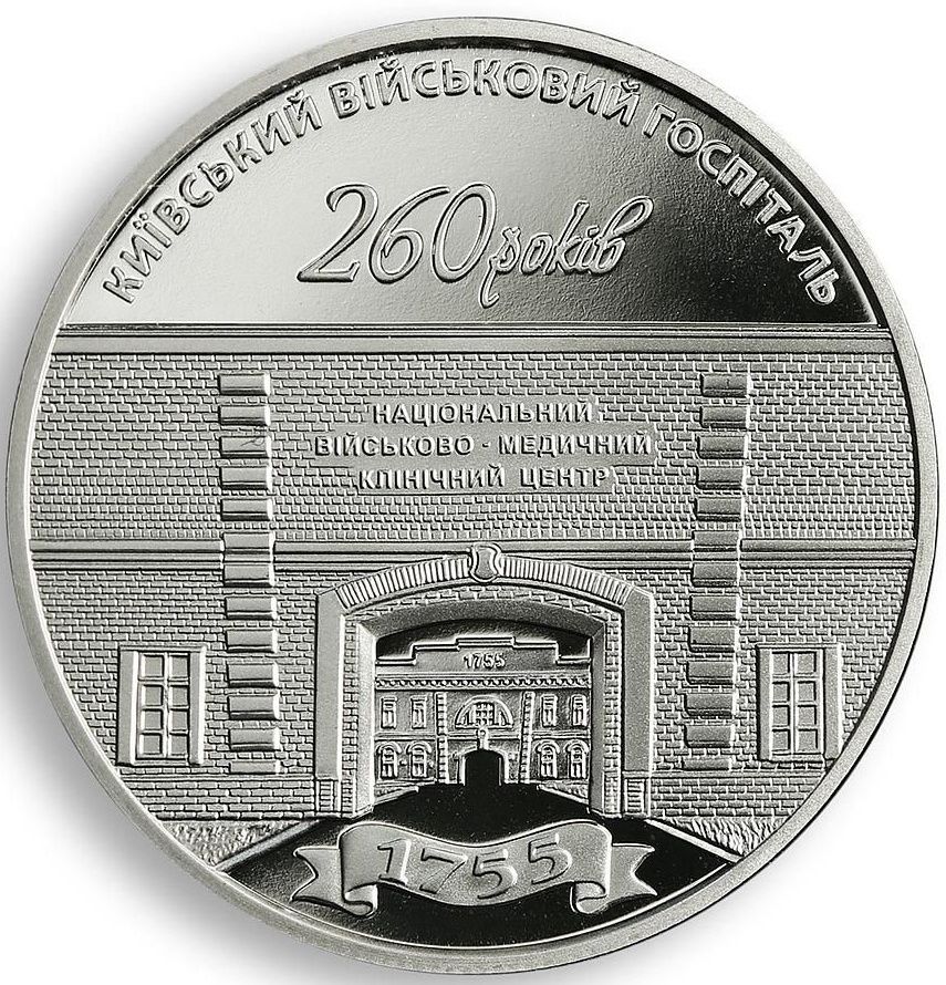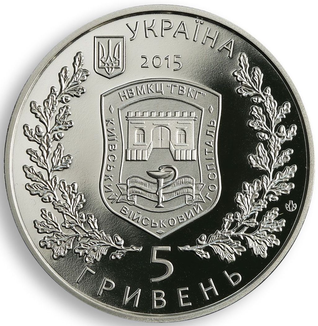 Опис: Зверху розміщено напис «УКРАЇНА» з роком випуску монети — 2015; ліворуч — малий герб України; у центрі — логотип Національного військово-медичного клінічного центру «Головна військова клінічна лікарня»; під логотипом — номінал монети 5/ГРИВЕНЬ (5/гривень) і знак Монетного двору Національного банку України (праворуч).