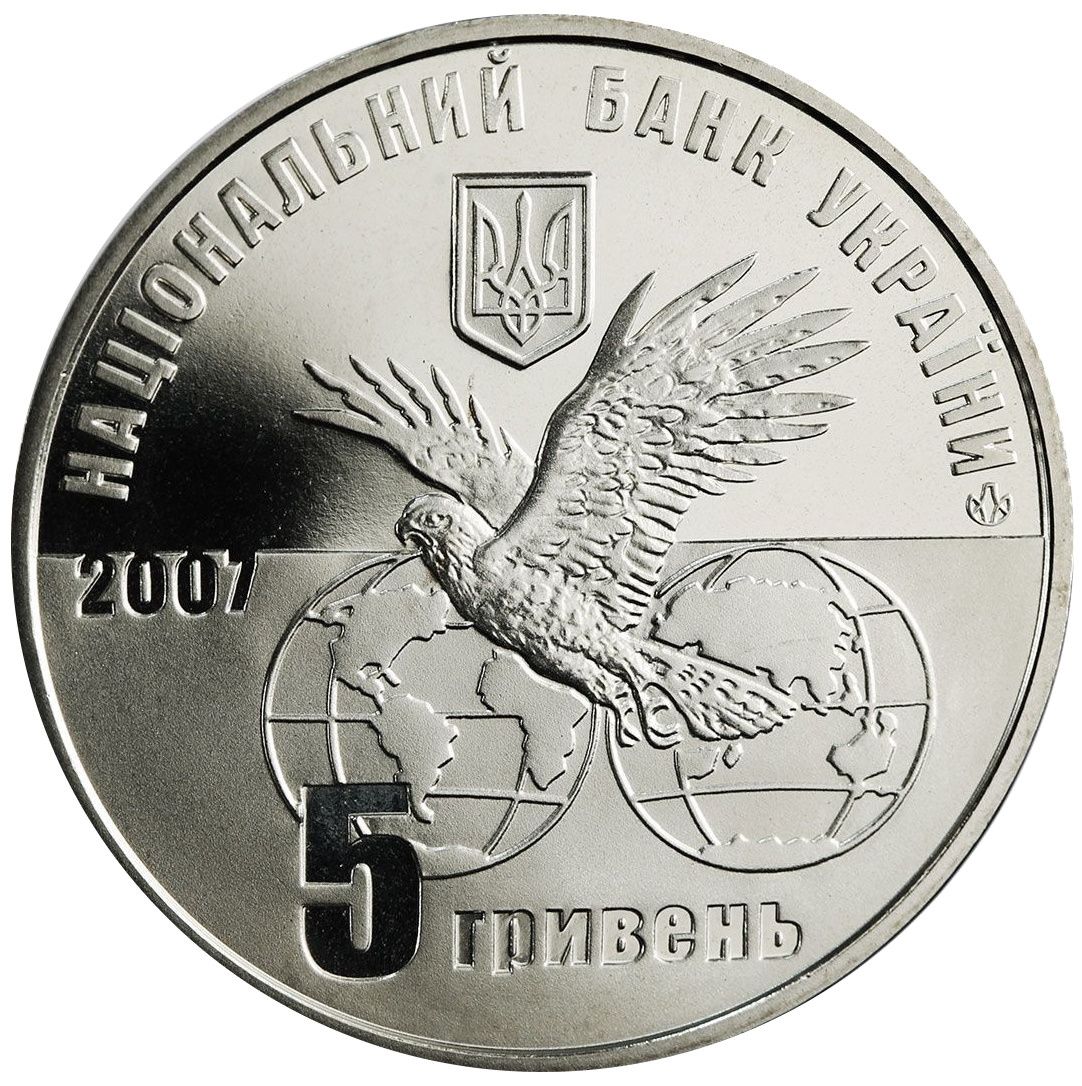 Опис: На тлі земної кулі зображено сокола, зверху — малий герб України з написом НАЦІОНАЛЬНИЙ БАНК УКРАЇНИ (Національний банк України) по колу, ліворуч — рік випуску монети 2007 та 5 ГРИВЕНЬ (5 гривень), а також логотип Монетного двору Національного банку України.