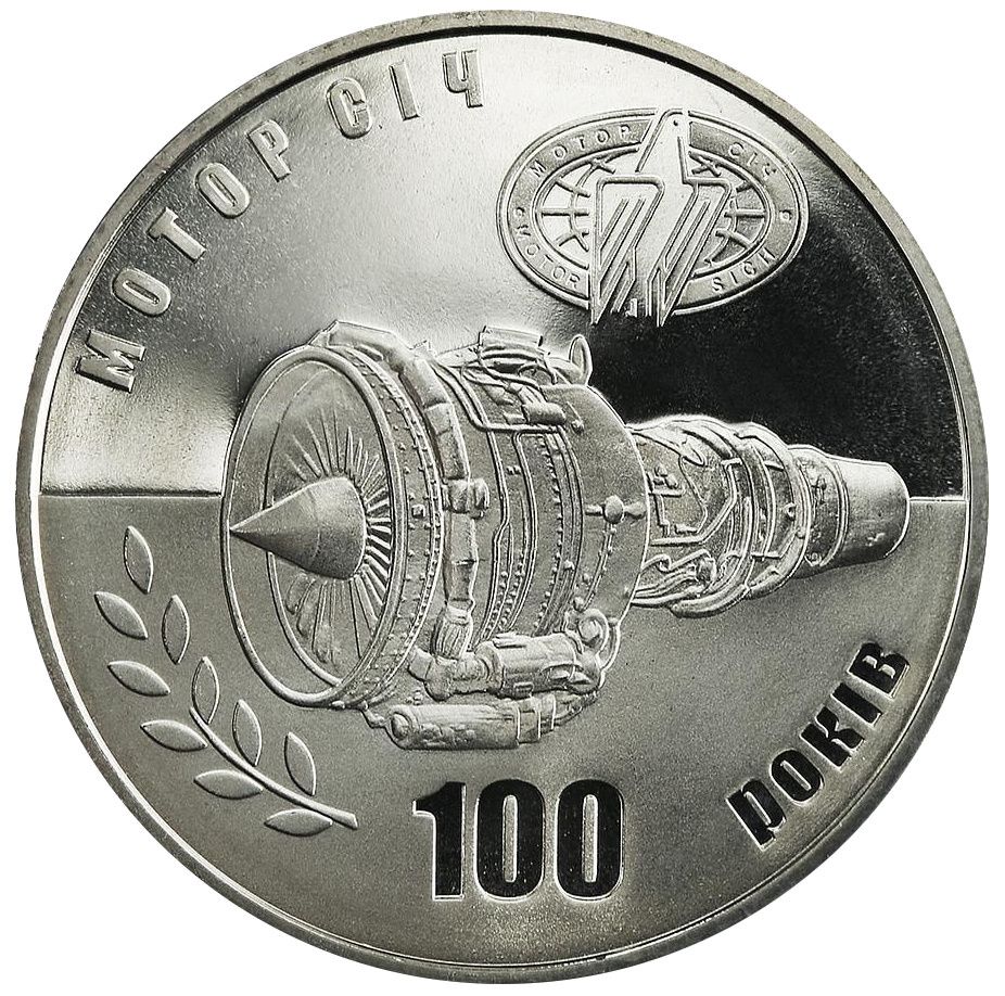 Опис: Зображено авіаційний двигун, праворуч вгорі — логотип АТ «Мотор Січ» та написи: МОТОР СІЧ (Motor-Sich) ліворуч вгорі та 100 РОКІВ (100 років) внизу.