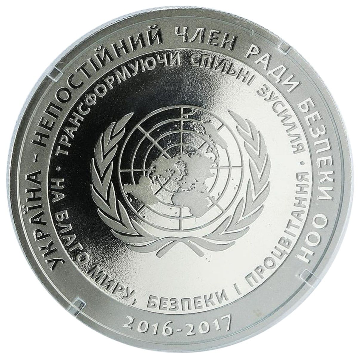 Опис: На гладкому тлі зображено емблему ООН, оточену такими написами: ТРАНСФОРМУЮЧИ СПІЛЬНІ ЗУСИЛЛЯ НА БЛАГО МИРУ, БЕЗПЕКИ І ПРОЦВІТАННЯ (Перетворюючи спільні зусилля на благо миру, безпеки та процвітання); на матовому тлі зображено такі кругові написи: УКРАЇНА - НЕПОСТІЙНИЙ ЧЛЕН РАДИ БЕЗПЕКИ ООН, 2016-2017 (Україна: непостійний член Ради Безпеки ООН, 2016-2017).