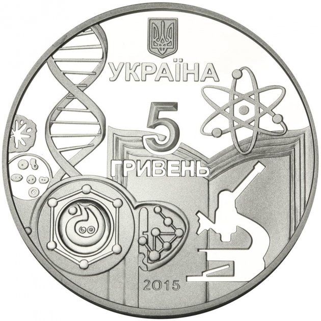 Опис: Зверху зображено малий герб України з написом «УКРАЇНА» (Україна) під ним; стилізована композиція, що символізує галузі науки та освітній процес; у центрі — номінал 5/ГРИВЕНЬ (5/гривень) та рік випуску 2015 (внизу).