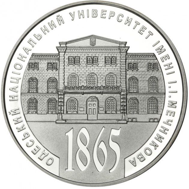 Опис: На темному тлі зображено Одеський національний університет імені І. Мєчникова, а по колу монети розміщено напис ОДЕСЬКИЙ НАЦІОНАЛЬНИЙ УНІВЕРСИТЕТ ІМЕНІ І. І. МЕЧНИКОВА (Одеський національний університет імені І. Мечникова), нижче на рельєфному тлі викарбувано 1865 рік — рік заснування університету.