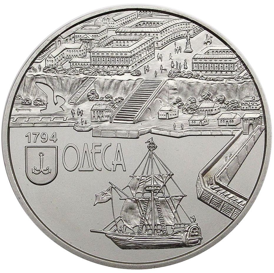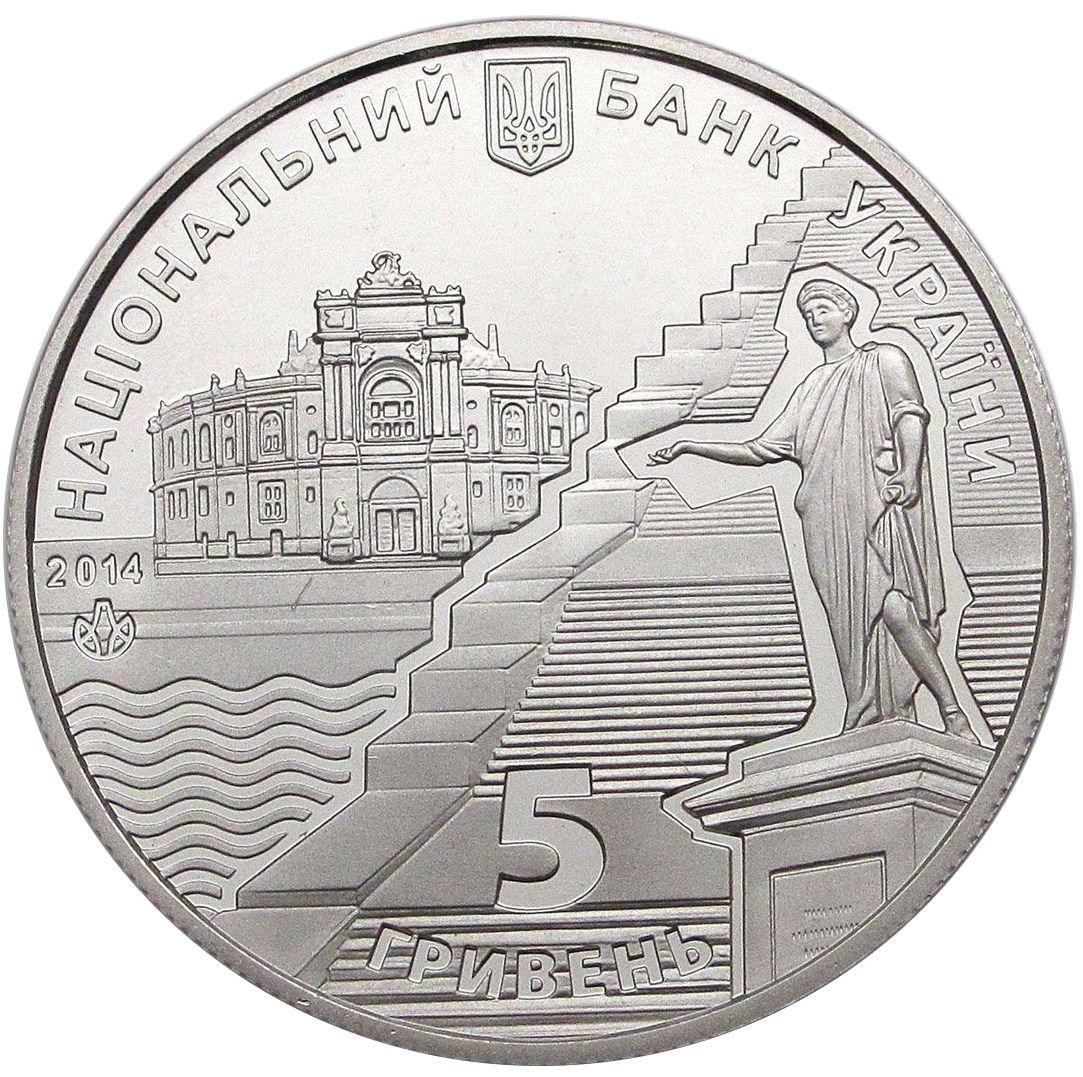 Опис: Вгорі — малий герб України з напівкруглим написом НАЦІОНАЛЬНИЙ БАНК УКРАЇНИ (Національний банк України); ліворуч — позначення року випуску монети 2014 з маркою Монетного двору Національного банку України під ним; стилізована композиція, що зображає пам'ятник герцогу Рішельє на тлі Потьомкінських сходів (праворуч), Одеський національний академічний театр опери та балету (ліворуч) зі стилізованим зображенням хвиль під ним; знизу - номінал монети: 5/ГРИВЕНЬ (5/гривень).