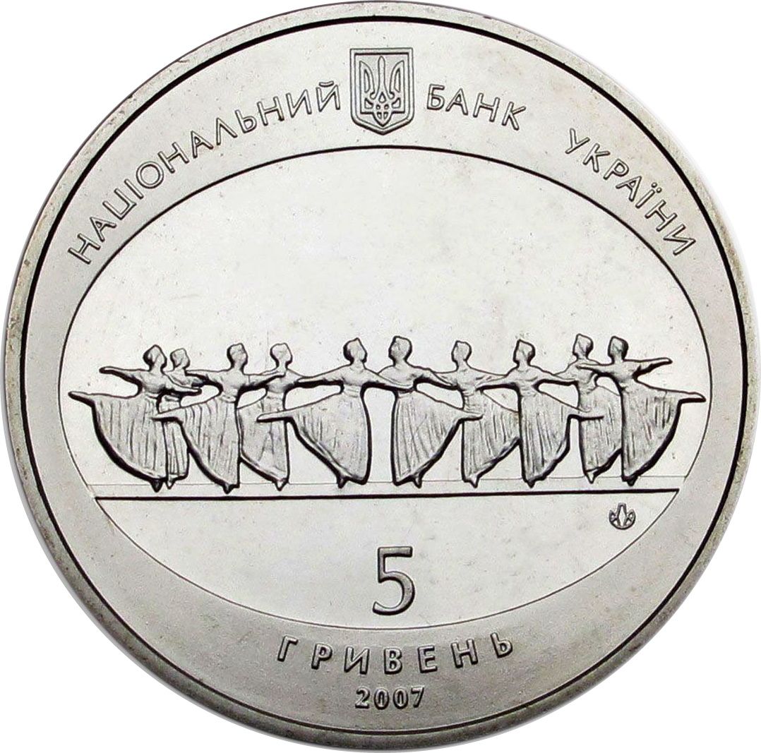 Опис: На монеті зображено балетну сцену, малий герб України (вгорі) та напис НАЦІОНАЛЬНИЙ БАНК УКРАЇНИ (Національний банк України); внизу — 5/ ГРИВЕНЬ (5 гривень) та рік випуску монети — 2007.