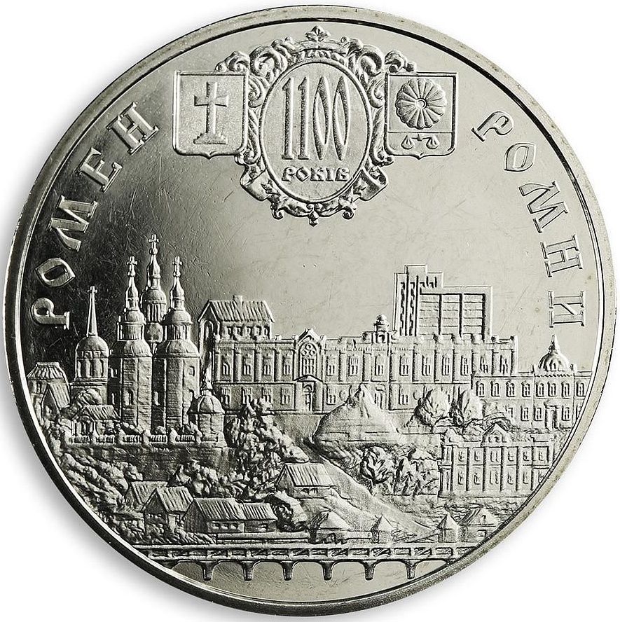 Опис: У верхній частині монетного поля та між круговими написами: РОМЕН - РОМНИ (Ромни (Ромен) там зображено старовинний і сучасний герби міста на тлі барокової рамки з написом: 1100 / РОКІВ (1100 років); у нижній частині поля монети зображено об'єднані архітектурні пам'ятки та сучасні споруди міста