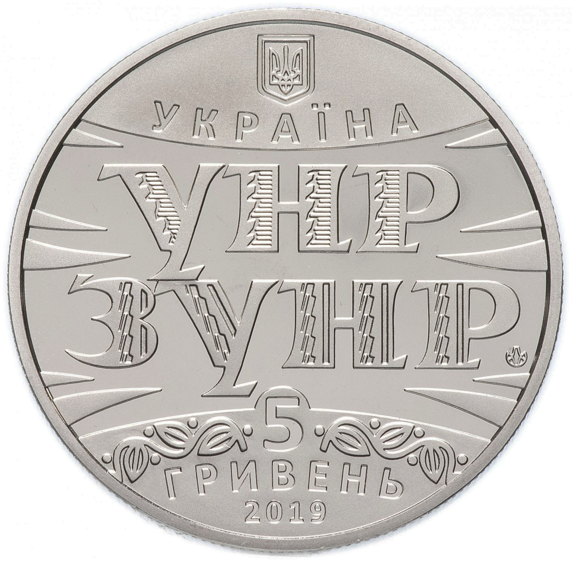 Опис: Зверху розміщено малий герб України, під яким напис UKRAINE; у центрі на дзеркальному тлі — шрифтова композиція абревіатур УНР / ЗУНР, літери якої прикрашені характерними орнаментами; внизу на матовому тлі — номінал 5 / ГРИВЕНЬ, по боках якого стилізований рослинний орнамент, рік випуску монети 2019 (знизу); Логотип Банкнотно-монетного двору Національного банку України (праворуч на дзеркальному тлі).