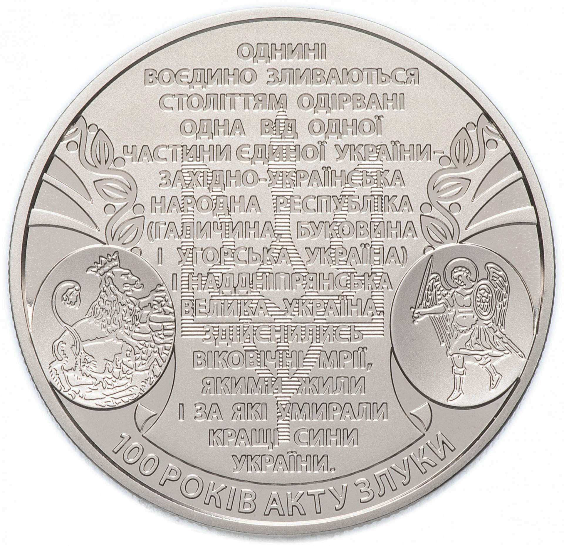 Опис: На темному тлі звороту монети розміщений фрагмент Акту про об'єднання, однина / разом об'єднуються / століття населені / окремо / частина УКРАЇНИ - / ЗАХІДНОУКРАЇНСЬКА / НАРОДНА РЕСПУБЛІКА / (Галичина, Буковина / та Угорська УКРАЇНА) / Я Дніпро / велика УКРАЇНА . / ДОСВІД / ОКО-ЦІЛЬ, / ЯКА ЖИТЛА / І ЗА ЯКУ УМІРАЛИ / НАЙКРАЩІ СОНЦЯ / УКРАЇНА. Приховане зображення в тексті оглядає зображення тризуба. Ліворуч і праворуч від напису розташовані медальйони з символами земель: ліворуч - Західна Україна (ліворуч) і Архангел Михаїл - Центральна Україна (праворуч), з яких піднімається стилізований рослинний орнамент у вигляді лаврових гілок, нижче напівкруглий напис 100 РОКІВ АКТУ ПРО ЄДНІСТЬ.