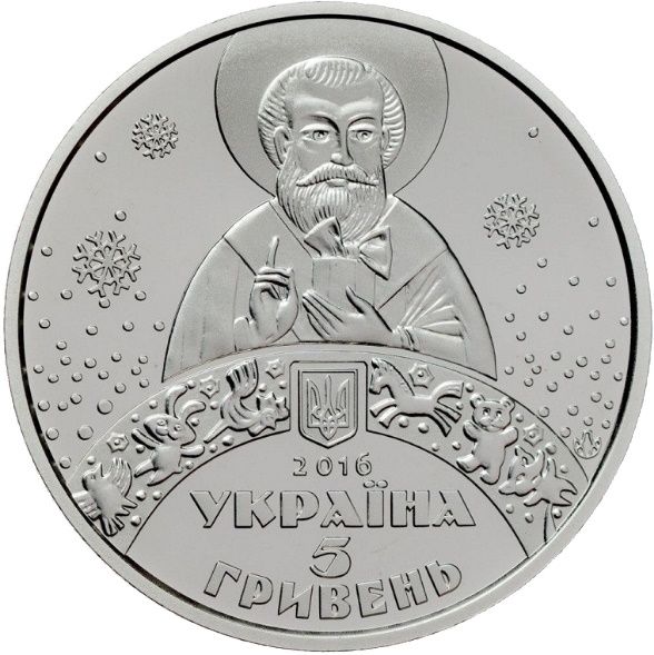Опис: На монеті зображено традиційне зображення Святого Миколая, під яким розташована веселка з іграшками, малий герб України, рік випуску монети 2016, напис «УКРАЇНА» та номінал монети «5 ГРИВЕНЬ»; праворуч — знак монетного двору ДП «Держдрукарня та монетний двір НБУ».