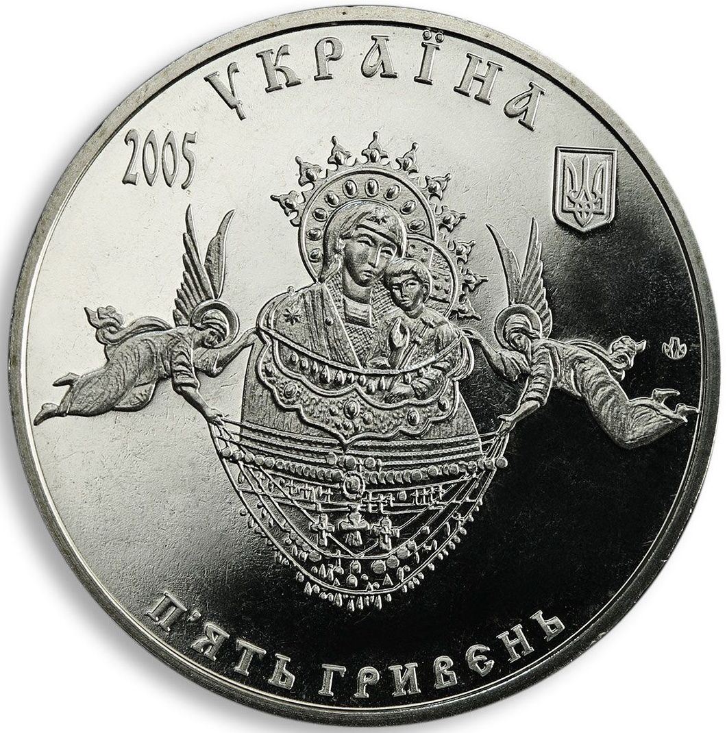 Опис: На монеті зображено чудотворну ікону Святогірської Божої Матері, по обидва боки якої стоять два ангели, що тримають дари: монети, хрести, підвіски тощо; зверху — напівкруглий напис: УКРАЇНА (Україна), праворуч: малий Державний герб України, ліворуч: 2005, рік випуску монети; знизу півколом: П'ЯТЬ ГРИВЕНЬ (5 гривень) та логотип Монетного двору Національного банку України.