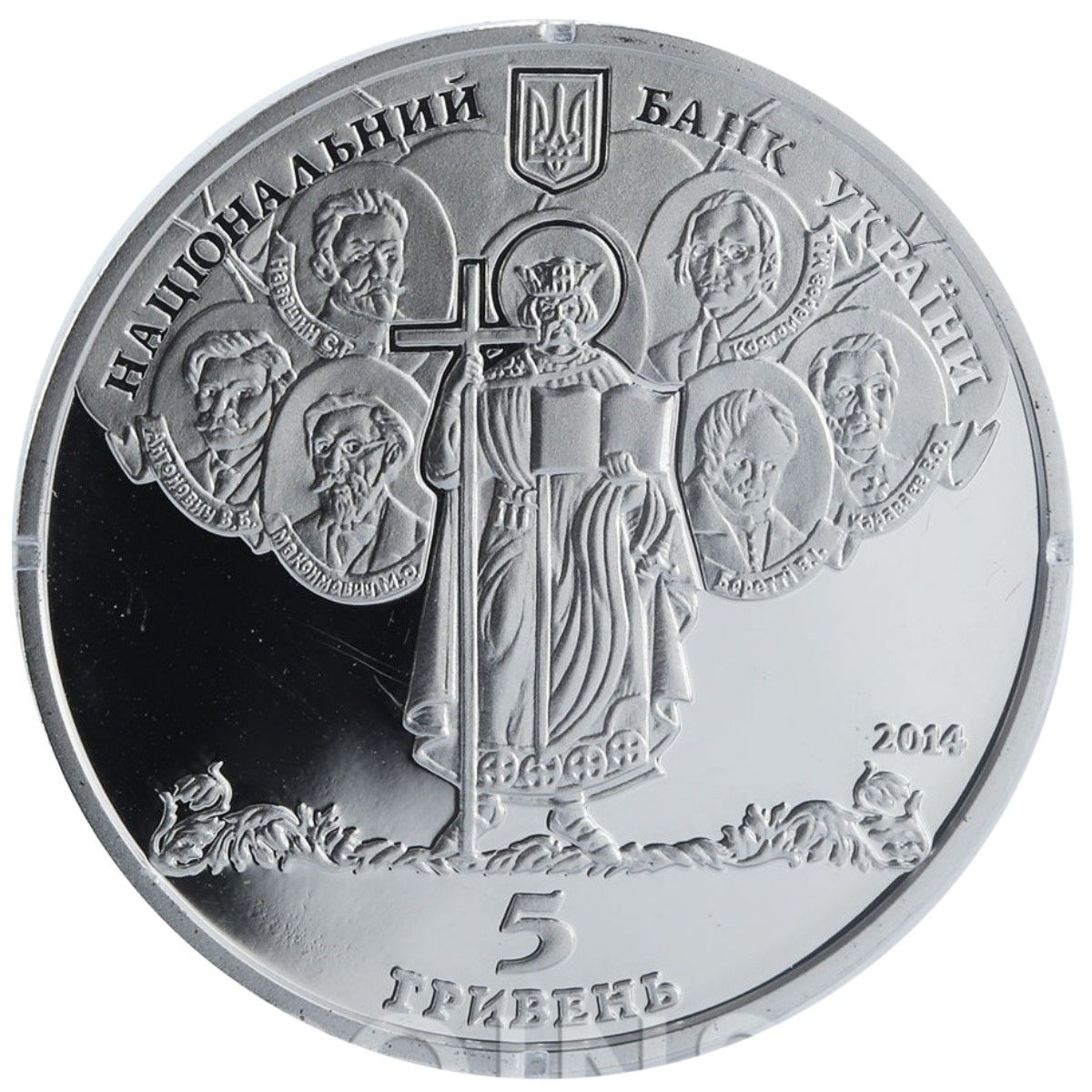 Опис: Зображено: зверху — малий герб України з напівкруглим написом НАЦІОНАЛЬНИЙ БАНК УКРАЇНИ; у центрі — стилізована композиція — на тлі портретів видатних особистостей, пов'язаних із заснуванням та діяльністю Київського університету, зображено постать Святого Володимира; внизу — номінал монети: 5 ГРИВЕНЬ (5 гривень); ліворуч — знак Монетного двору Національного банку України; праворуч — позначення року випуску монети 2014.