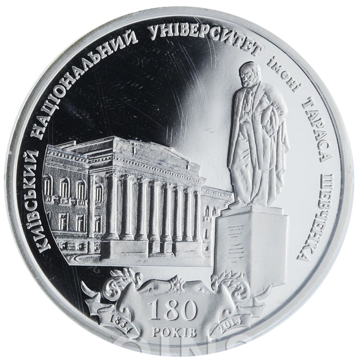 Опис: На дзеркальній поверхні зображено будівлю Київського національного університету імені Тараса Шевченка (на німецькій срібній монеті вона червона, використано тамподрук), пам'ятник Тарасу Шевченку; нижче розміщені написи 180/РОКІВ, 1834, 2014 (180/років, 1834, 2014); зверху, вздовж краю монети, розміщено напис КИЇВСЬКИЙ НАЦІОНАЛЬНИЙ УНІВЕРСИТЕТ ІМЕНІ ТАРАСА ШЕВЧЕНКА (Київський національний університет імені Тараса Шевченка).