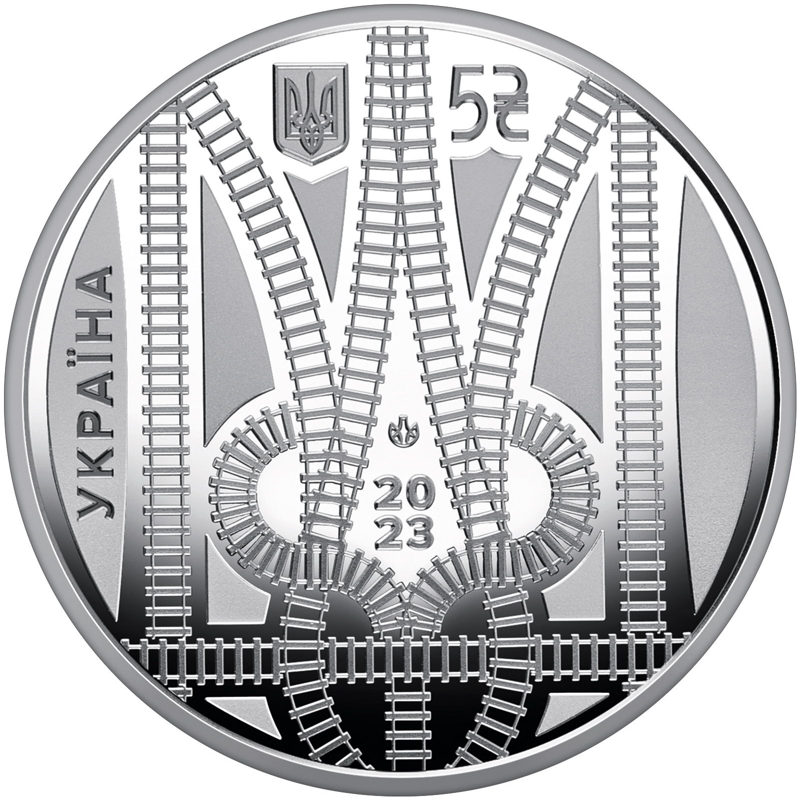 Опис: Стилізований тризуб, контури якого окреслені зображенням залізничних колій. У центрі, на дзеркальному тлі, розміщено логотип Національного банку України «Держдрукарня та монетний двір України», рік карбування монети — 20 / 23; у верхній частині — малий Державний герб України, номінал монети — 5 та графічний знак гривні; напис УКРАЇНА (ліворуч).