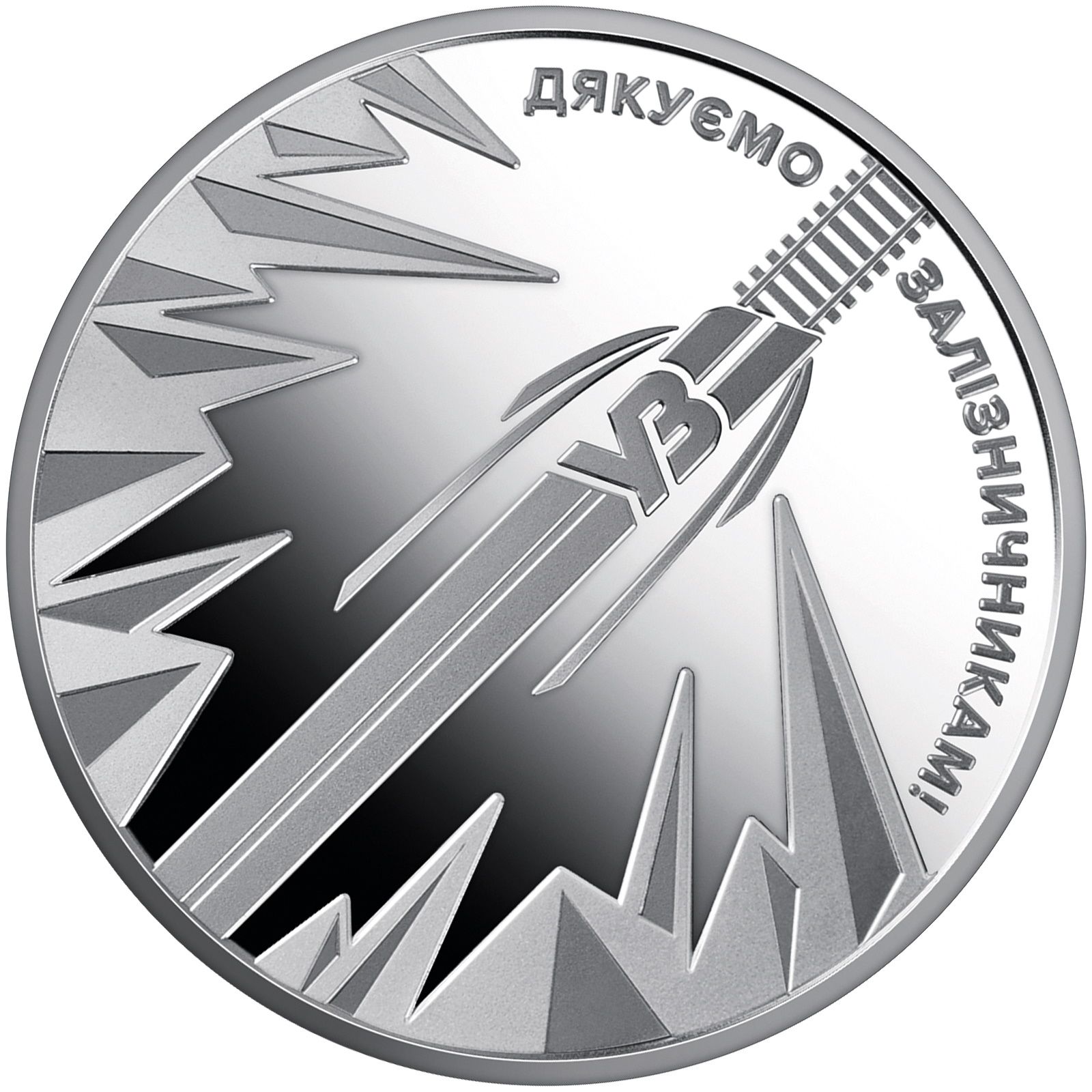 Опис: Поїзд, стилізований під логотип «Укрзалізниці», що виривається з оточення; по обидва боки поїзда — символічна композиція, що містить гострі кінці, спрямовані на нього; зверху — напис ДЯКУЄМО ЗАЛІЗНИЧНИКАМ! Мотив реверсу ілюструє реальні події початку повномасштабного вторгнення, коли українські залізничники, ризикуючи власним життям, рятували людей на кордоні Херсонської та Запорізької областей. Танки агресора намагалися зупинити евакуацію цивільного населення, переслідуючи та перетинаючи поїзд.