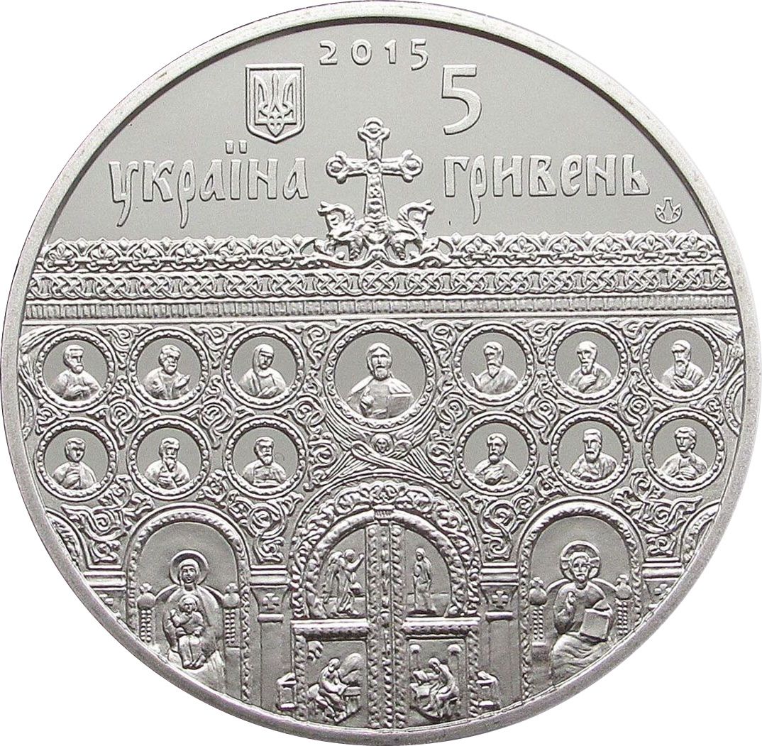 Опис: Зверху вказано рік випуску — 2015, малий герб України (зліва) з написом «УКРАЇНА» (Україна) знизу; номінал — 5/ГРИВЕНЬ (праворуч) з позначкою Монетного двору Національного банку України знизу. Основним композиційним елементом аверсу є стилізований фрагмент іконостасу та святі двері собору.