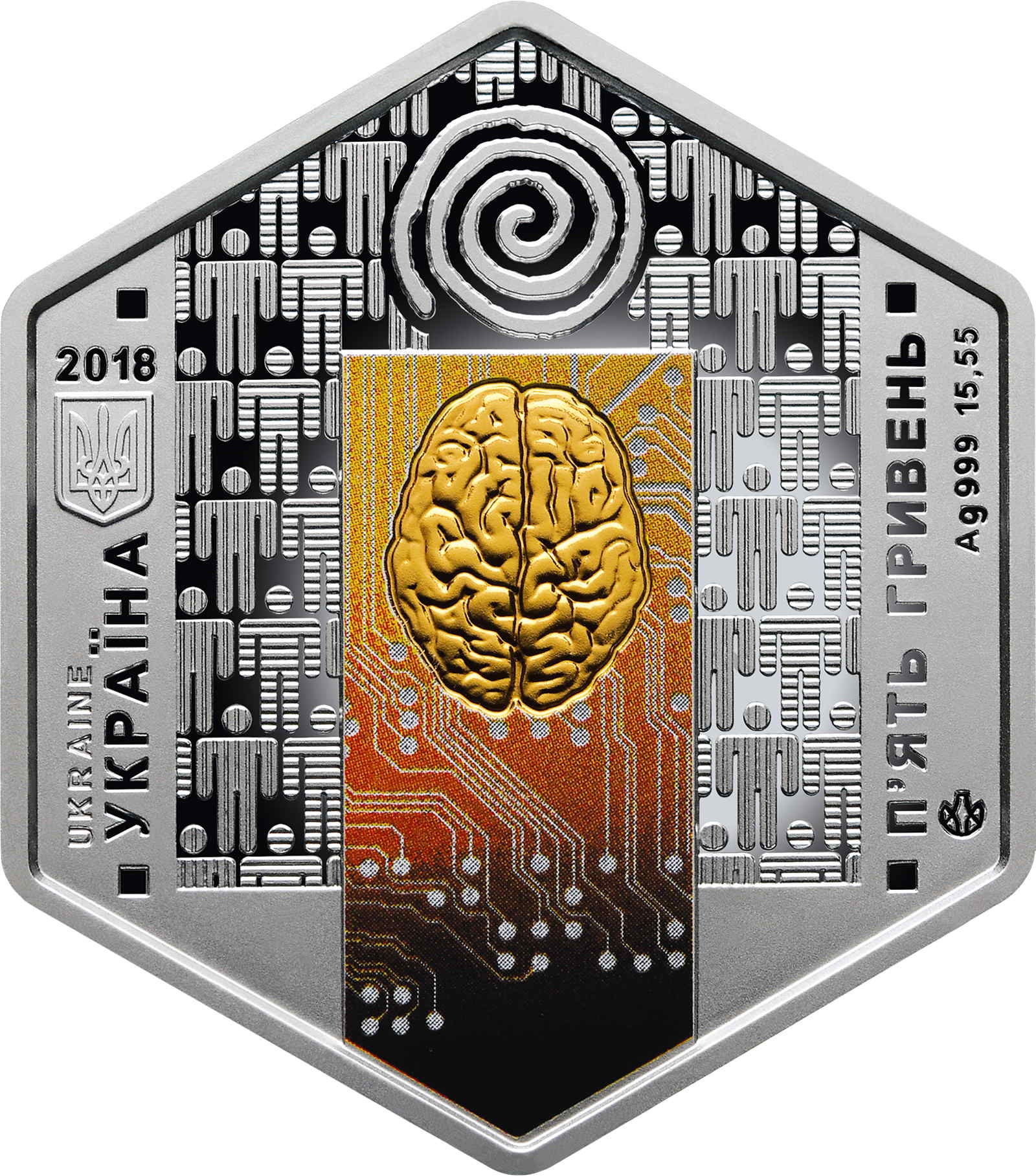Опис: Зліва вказано рік випуску монети 2018, малий герб України та вертикальні написи UKRAINE/УКРАЇНА; праворуч — номінал монети П’ЯТЬ ГРИВЕНЬ (п’ять гривень), метал і проба монети Ag 999 15,55 (Ag 999 15,55) (вертикально) та знак монетного двору Дrukárno-монетного двору НБУ (знизу); зверху, на тлі стилізованих людських фігур, зображено графічне зображення спіралі часу, що символізує еволюцію, розвиток, безперервний рух і життєву силу і відома ще з трипільських часів (трипільська культура — давня українська культура, що датується шостим тисячоліттям до н. е.); під спіраллю розміщено таку стилізовану композицію: на коричневому тлі (тамподрук) з мікрочіпами зображено людський мозок (локальне золочення, вага не менше 0,0001 г).