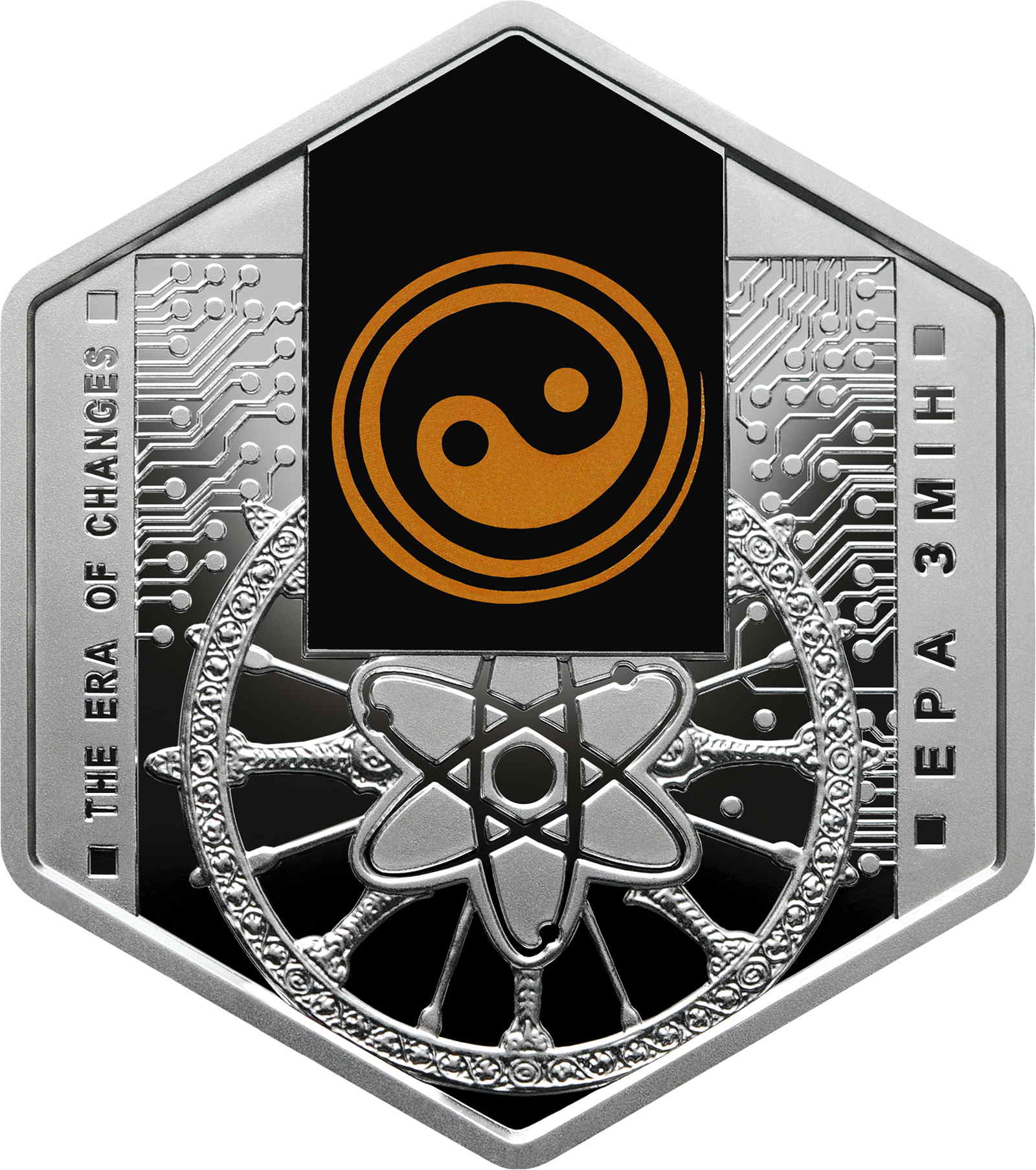 Опис: На тлі мікрочіпів розміщено таку композицію: на чорному тлі — стародавній символ інь і янь (кольоровий, нанесений тамподруком); під символом — архаїчне колесо, що символізує сонце, життєві цикли, відродження та зміни; у центрі колеса — атомна модель, що символізує наукові та технологічні досягнення; є такі вертикальні написи: THE ERA OF CHANGES (зліва) та ЕРА ЗМІН (праворуч).