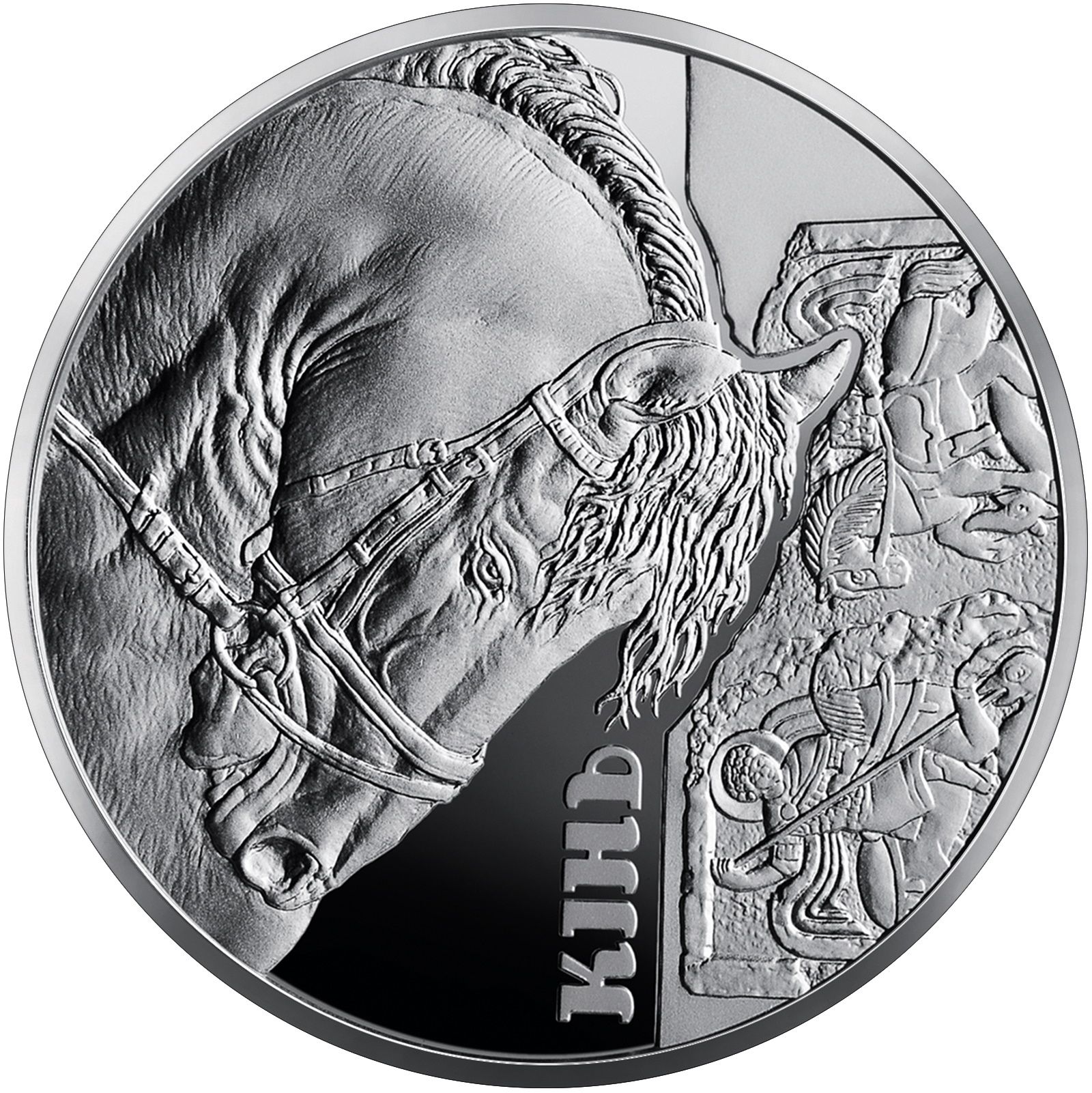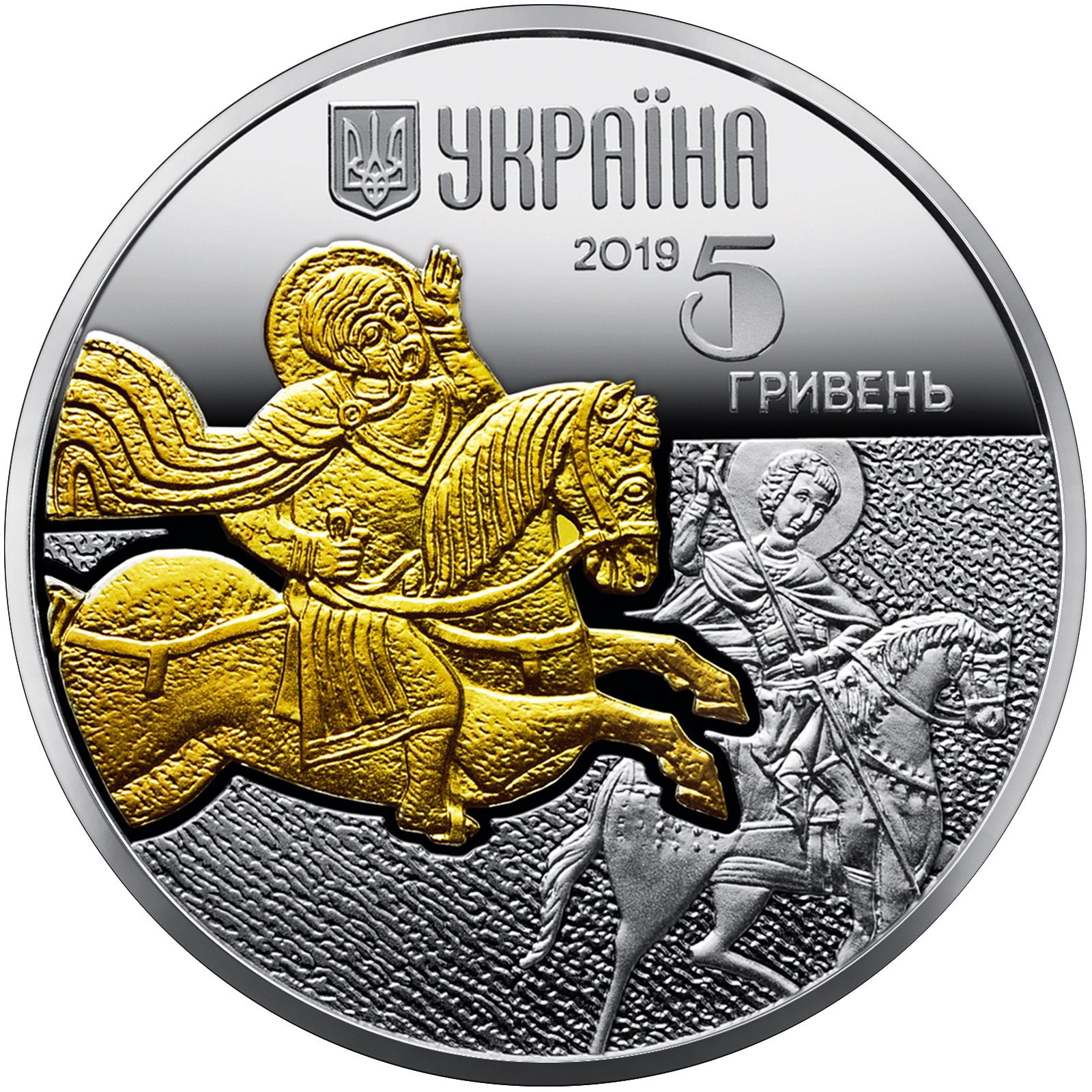 Опис: Маленький Державний герб України, напис UKRAINE, під яким вказано рік випуску монети 2019 та номінал 5 / ГРИВЕНЬ; у центрі — позолочене зображення фрагмента київського кам'яного рельєфу XI століття. зображує святого мученика Євстахія Плакида на тлі (праворуч) зображення святого Георгія Побідоносця з ікони другої половини XV століття.