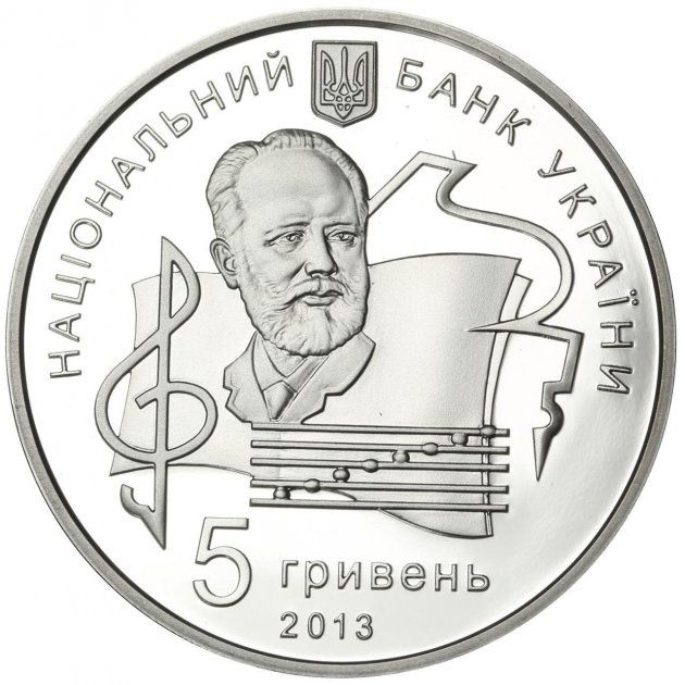 Опис: Зверху розміщено малий герб України та напівкруглий напис НАЦІОНАЛЬНИЙ БАНК УКРАЇНИ; на тлі стилізованої композиції, що зображує рояль, скрипковий ключ та нотний стан, розміщено портрет П. І. Чайковського; під ним – номінал монети: 5 гривень; нижче – рік випуску монети 2013.