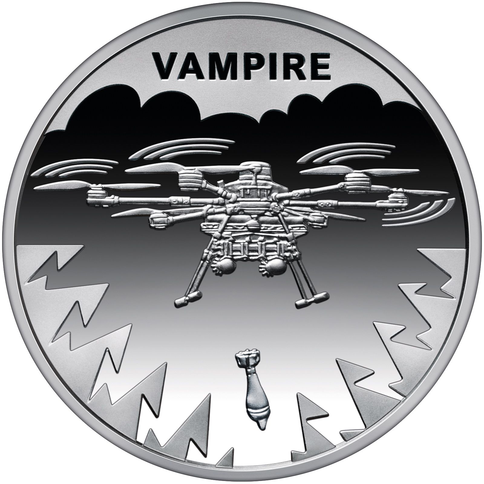 Опис: Гексакоптер «Вампір» зображений у вирішальний момент виконання бойового завдання — під час польоту, коли він скидає боєприпаси.