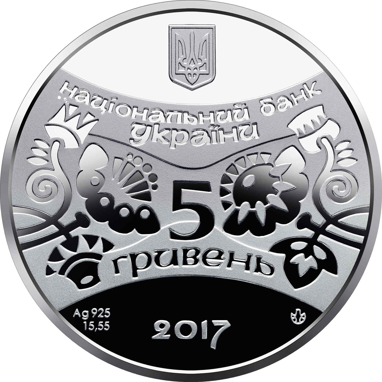 Опис: Зверху зображено малий герб України, під яким розміщено напис НАЦІОНАЛЬНИЙ БАНК/УКРАЇНИ (Національний банк України); у центрі, оточеному стилізованим рослинним орнаментом, — номінал монети 5/ГРИВЕНЬ (5/гривень); нижче — рік випуску монети — 2017, метал монети — Ag 925, вага — 15,55 г, а також знак монетного двору ДП «Банкнотно-монетний двір НБУ».