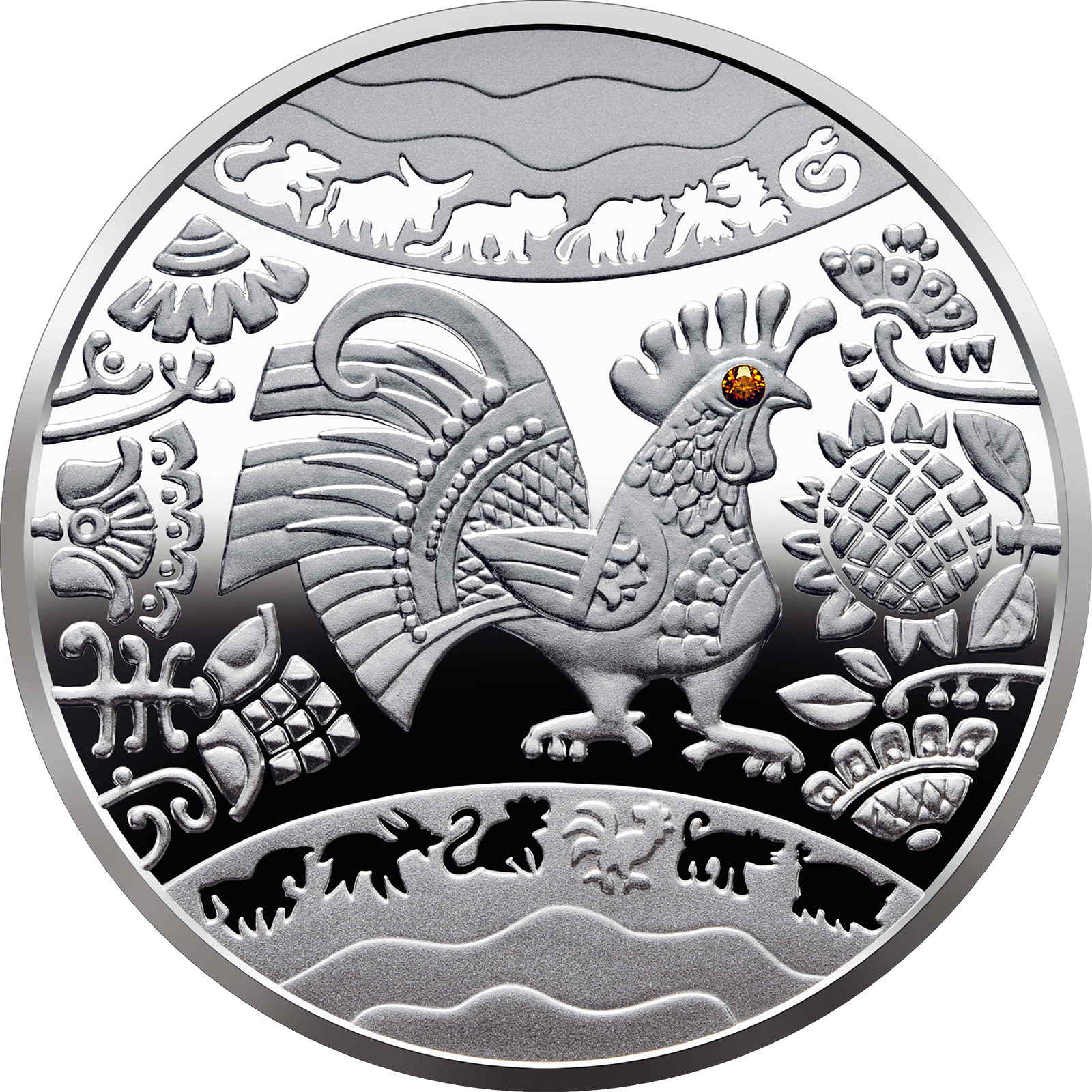 Опис: В оточенні стилізованого квіткового орнаменту зображено півня, виконаного в стилі лубок. Око півня прикрашено жовтим кубічним цирконієм. Над і під цією композицією розміщені ескізи всіх 12 символів китайського календаря.