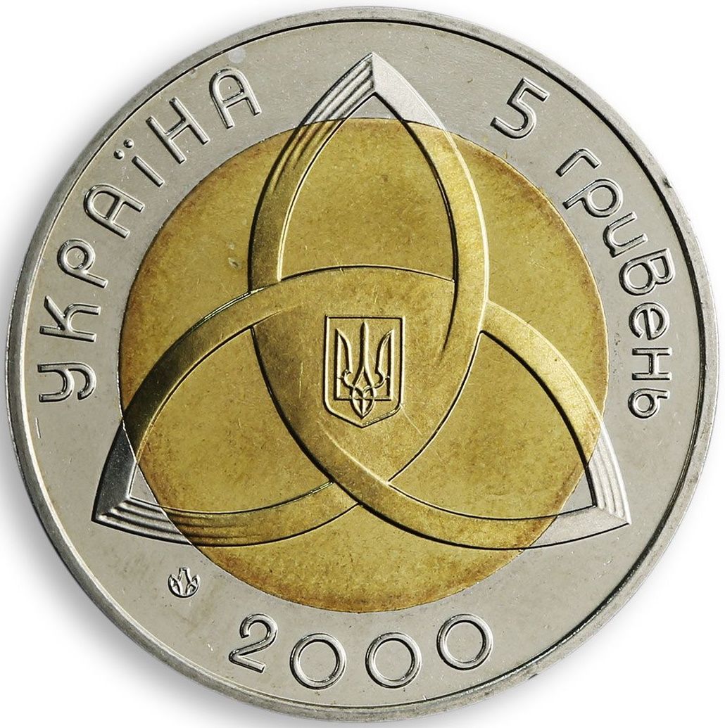 Опис: На тлі дзеркала зображено яскравий трипелюстковий орнамент, утворений трьома півколами, що символізують триєдність минулого, сьогодення та майбутнього. У центрі цього орнаменту розміщено невеликий Державний герб України. Між пелюстками розміщено кругові написи: УКРАЇНА, 5, ГРИВЕНЬ, 2000 (Україна/ 5/ гривня/ 2000) та логотип Монетного двору Національного банку України.
