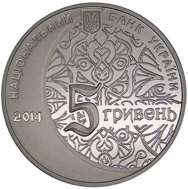 Опис: Зверху — малий герб України з напівкруглим написом НАЦІОНАЛЬНИЙ БАНК УКРАЇНИ (Національний банк України) та зазначенням року випуску монети 2014 (під ним, ліворуч); у центрі, на тлі стилізованого орнаментального візерунка, номінал: 5 ГРИВЕНЬ (5 гривень) разом із знаком Монетного двору Національного банку України.