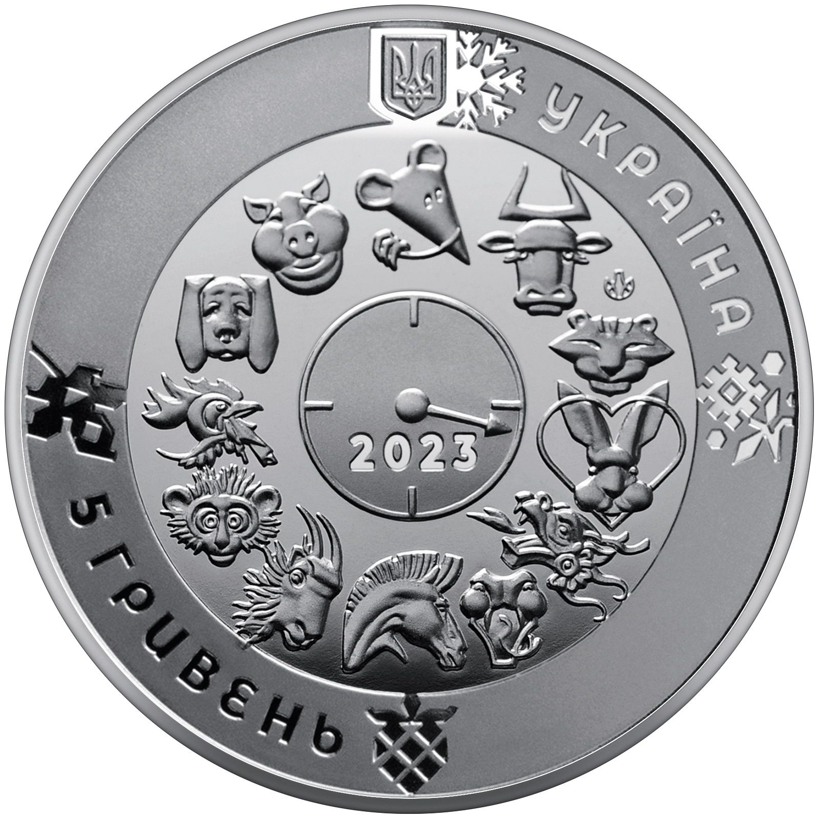 Опис: У верхній частині — малий Державний герб України, праворуч від якого напівколом розміщено напис УКРАЇНА; 12 символів східного календаря зображено у колі на дзеркальному тлі, у центрі кола — стилізований годинник зі стрілкою, що вказує на кролика — символ року, під стрілкою — 2023; внизу ліворуч напис півколом 5 ГРИВЕНЬ.