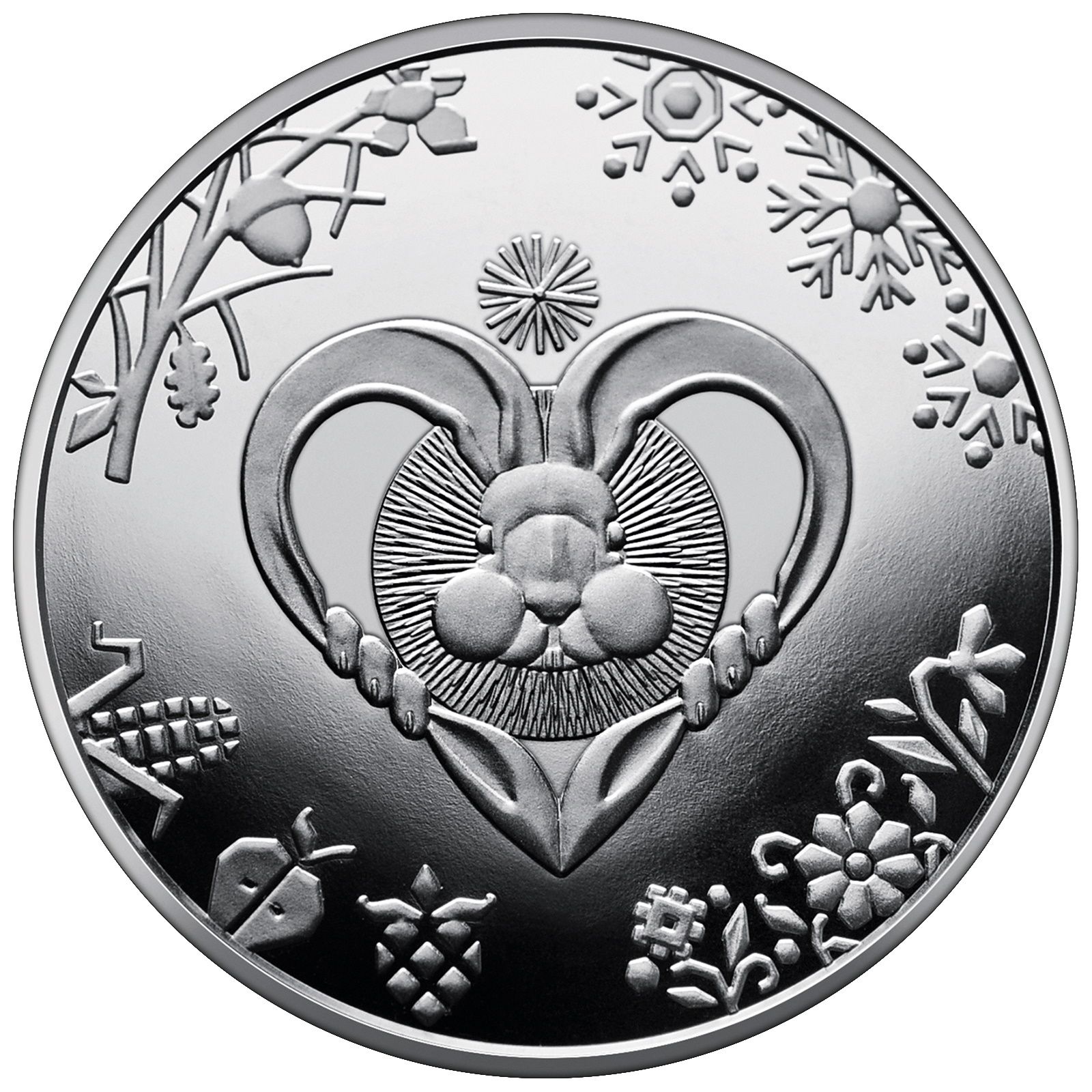 Опис: На зворотному боці монети зображено стилізований символ східного календаря 2023 року — кролика, оточеного стилізованими символами кожного сезону: сніжинками (у правому верхньому куті), квітами (у правому нижньому куті), фруктами (у лівому нижньому куті), гілками (у лівому верхньому куті).