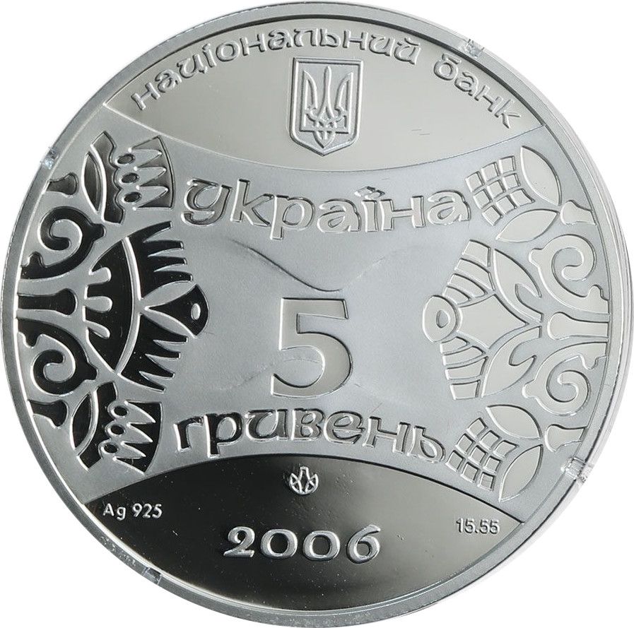 Опис: По краях монети розміщений рослинний орнамент у стилі примітивізму, а також написи: УКРАЇНА / 5 / ГРИВЕНЬ (Україна, 5 гривень); зверху – малий герб України з написом над ним: НАЦІОНАЛЬНИЙ БАНК, нижче – рік випуску монети – 2006, позначення металу та його проби – Ag 925, вага в пробі – 15,55 г та логотип Монетного двору Національного банку України.