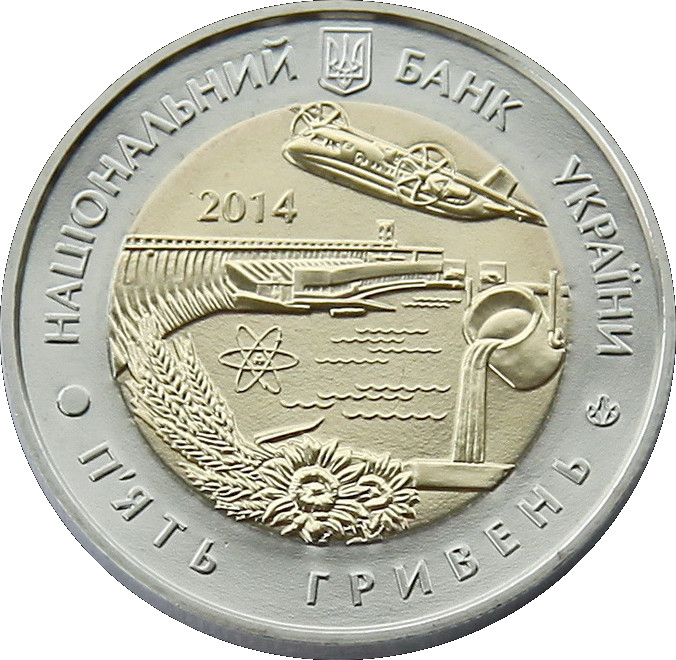 Над нею вказано рік випуску монети 2014 з регіональними символами навколо греблі: літак (автомобільна промисловість), ковш для виливання сталі (металургія чорних металів), соняшник і пшеничні колоски (сільське господарство), а також атом як символ миру (атомна енергетика).