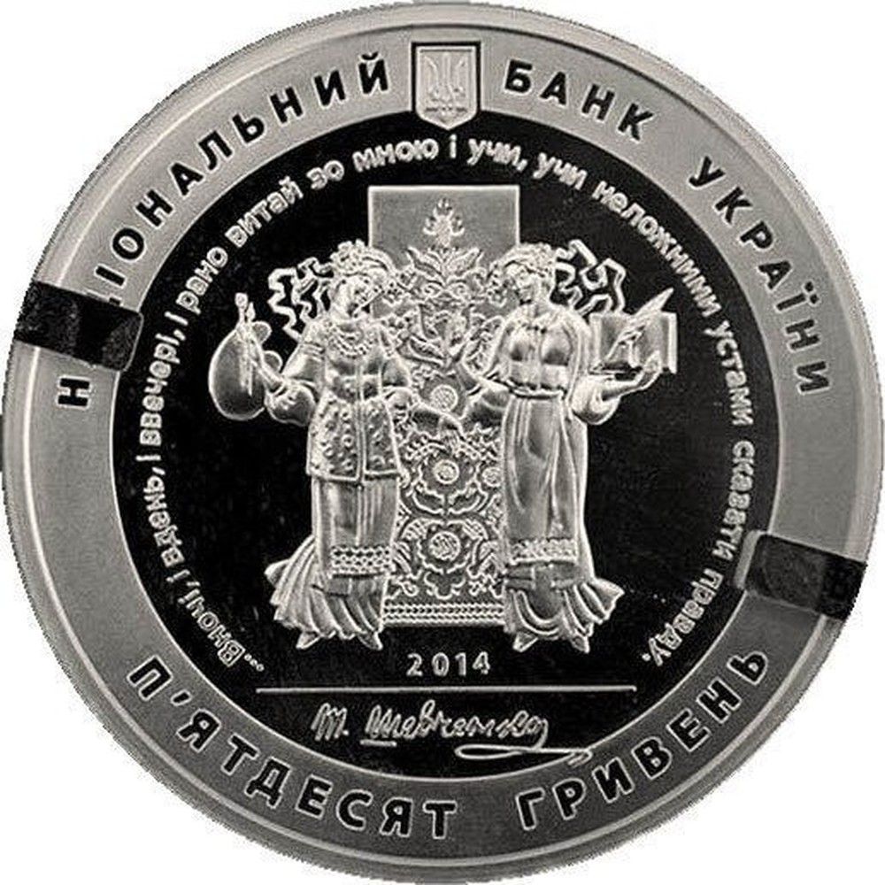Опис: Зверху розміщено малий герб України з напівкруглим написом НАЦІОНАЛЬНИЙ БАНК УКРАЇНИ (Національний банк України); у центрі (у колі, утвореному лініями з вірша «Муза» ...ВНОЧІ, І ВДЕНЬ, І ВВЕЧЕРІ, І РАНО ВИТАЙ ЗО МНОЮ І УЧИ, УЧИ НЕЛОЖНИМИ УСТАМИ СКАЗАТИ ПРАВДУ. (… Вночі, і вдень, і ввечері, і рано вранці здіймайся зі мною і вчи, вчи небрежними устами говорити правду), на тлі рушника (вишитого рушника) зображено узагальнене алегоричне втілення таланту майстра - дві Музи, поезії та образотворчого мистецтва; внизу – позначення року випуску монети 2014, факсимільний підпис Т.Г.Шевченка та номінал у вигляді дужки: П'ЯТДЕСЯТ ГРИВЕНЬ (п'ятдесят гривень).