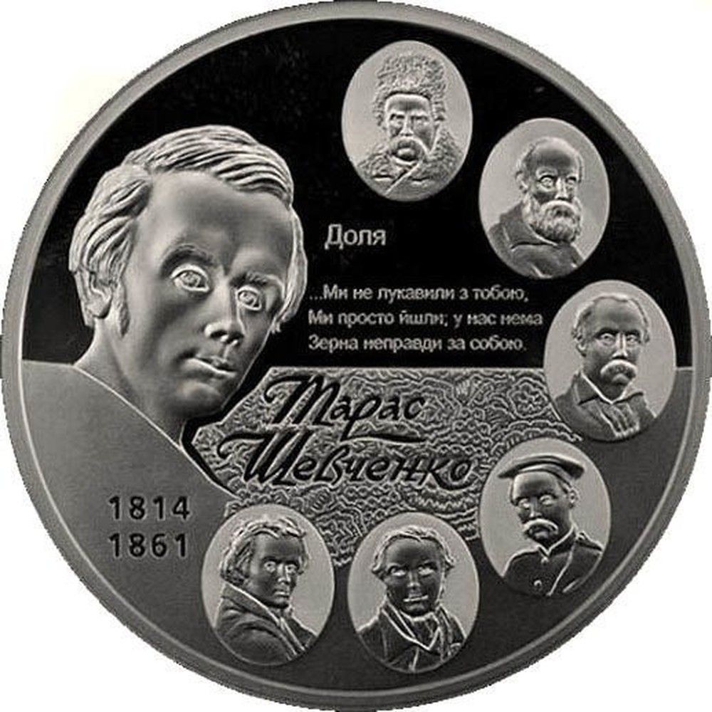 Опис: Монета розділена на дві частини (верхня поверхня гладка, нижня — рельєфна), що символізує звивисту долю поета, на ній зображено серію автопортретів Т. Г. Шевченка, що утворюють коло та ілюструють різні періоди життя майстра та його таланту; у центрі, на гладкій поверхні, розміщено рядки ДОЛЯ/…МИ НЕ ЛУКАВИЛИ З ТОБОЮ,/МИ ПРОСТО ЙШЛИ; У НАС НЕМА/ЗЕРНА НЕПРАВДИ ЗА СОБОЮ. (Доля / …ми не були лукавими, ти і я / ми просто йшли; ми не маємо / ні краплі неправди за собою.); нижче, на рельєфній поверхні, є напис ТАРАС/ШЕВЧЕНКО (Тарас / Шевченко), а ліворуч – вказівка на роки його життя 1814/1861.
