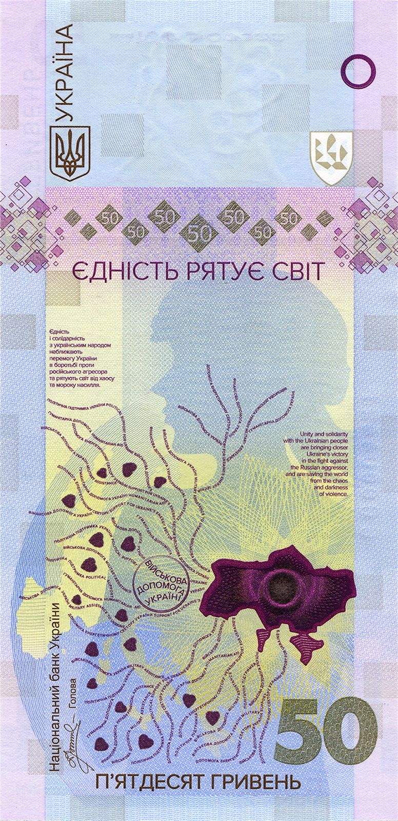 Опис: На аверсі пам'ятної банкноти, в центральній частині, розміщено художню композицію, що зображує стилізований контур України, який асоціюється з серцем, до якого прилягають судна. Фоном є зображення дівчини у військовому шоломі, яка дивиться на захід. У нижній частині пам'ятної банкноти на тлі глобуса зображено стилізоване зображення Європи, з країн якої, здається, відправляються судна-маршрути допомоги та підтримки для України. Стилізовані серця, розміщені між маршрутними суднами, символізують жертву та співчуття. У верхній частині пам'ятної банкноти по центру розміщено водяний знак. Праворуч від поля водяного знака розміщено прохідний елемент — стилізований шеврон Збройних Сил України та спеціальний рельєфний елемент у вигляді кола для людей з вадами зору. Ліворуч від поля водяного знака розміщено напис UKRAINE та зображення малого Державного герба України. Під полем водяного знака з обох боків розміщено стилізовану композицію із заповнених та контурних квадратів (у центральних квадратах зазначено номінал пам'ятної банкноти), напівпрозору смугу, заповнену контурами логотипу Національного банку України. Під смугою в центрі ювілейної банкноти розміщено напис «ЄДНІСТЬ РЯТУЄ СВІТ» та два текстові блоки (ліворуч і праворуч) українською та англійською мовами: «ЄДНІСТЬ / І СОЛІДАРНІСТЬ / З УКРАЇНСЬКИМ НАРОДОМ / ПЕРЕМОГА УКРАЇНИ НАБЛИЖАЄТЬСЯ / У БОРОТЬБІ ПРОТИ / РОСІЙСЬКОГО АГРЕСОРА / І ВРЯТУЄ СВІТ ВІД ХАОСУ / І ТЕМРЯВИ НАСИЛЬСТВА. ЄДНІСТЬ І СОЛІДАРНІСТЬ / З УКРАЇНСЬКИМ НАРОДОМ / НАБЛИЖАЮТЬ / ПЕРЕМОГУ УКРАЇНИ / У БОРОТЬБІ ПРОТИ / РОСІЙСЬКОГО АГРЕСОРА, / І РЯТУЮТЬ СВІТ / ВІД ХАОСУ / І ТЕМРЯВИ / НАСИЛЬСТВА. вертикальний напис НАЦІОНАЛЬНИЙ БАНК УКРАЇНИ, підпис Голови Національного банку України та слово ГОЛОВА - у нижній лівій частині; напис П'ЯТДЕСЯТ ГРИВЕНЬ - у центральній нижній частині. Числове позначення номіналу розміщено горизонтально у нижній правій частині пам'ятної банкноти. Дизайн лицьового боку банкноти доповнюють інші елементи, виконані багатокольоровим друком.