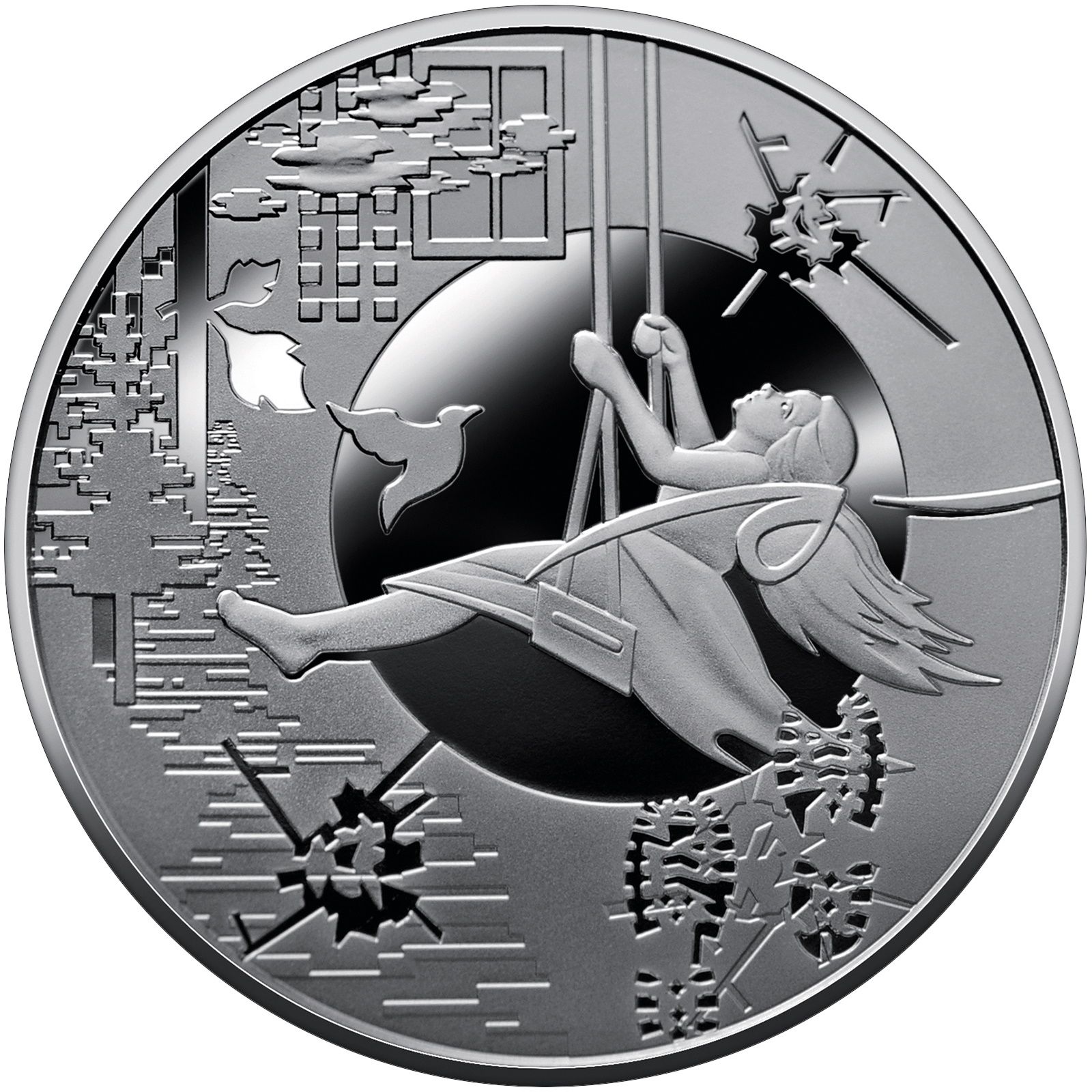 Опис: На монеті зображено дівчинку на гойдалці, стрічка в її волоссі розривається під час «польоту», що символізує перерване життя; внизу праворуч — відбитки брудних чобіт ворога, який вторгся в мирне життя українців; ліворуч — птах як символ продовження життя (біля дівчинки); стилізоване місто (вгорі); ліс; зображення «річки життя» (внизу).