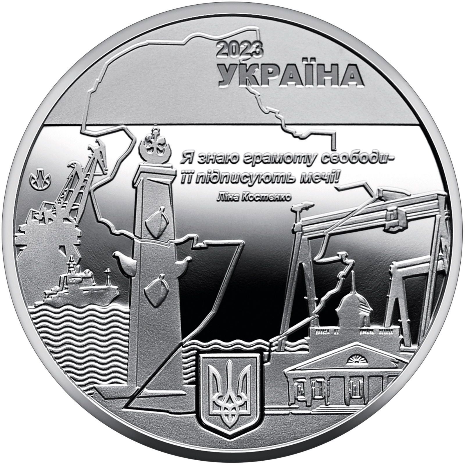 Опис: Зверху розміщено напис «2023/УКРАЇНА», знизу — малий герб України, а в центрі, на тлі стилізованої карти міста, — такі рядки з історичного роману Ліни Костенко «Берестечко»: Я ЗНАЮ ГРАМОТУ СВОБОДИ — / ЇЇ ПІДПИСУЮТЬ МЕЧІ! / ЛІНА КОСТЕНКО; стилізована композиція, яка показує, що Миколаїв – місто суднобудування та морський порт; праворуч – будівля Миколаївського музею суднобудування (єдиного в Україні); ліворуч – знак монетного двору ДП «Друкарня банкнот та монетний двір НБУ».