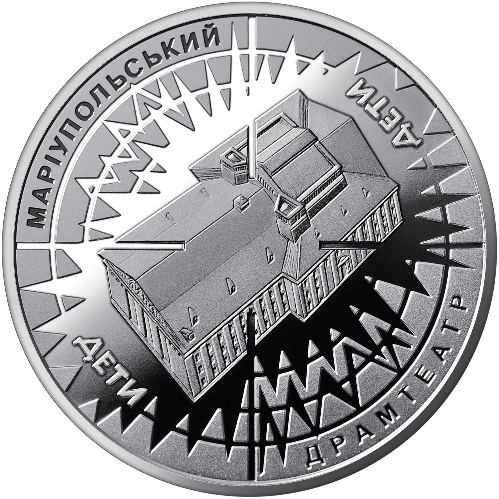 Опис: На дзеркальному тлі, що символізує вибух авіабомби, під перехрестям знаходиться будівля театру, перед фасадом якої великими літерами російською мовою написано ДЕТИ, а півколом — напис МАРІУПОЛЬСЬКИЙ ДРАМТЕАТР (внизу праворуч).