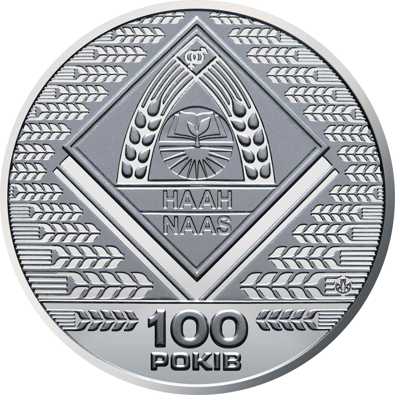 Опис: На тлі колосків пшениці зображено логотип Національної академії аграрних наук України; нижче — напис «100/РОКІВ» (100 років) з колосками пшениці по обидва боки; праворуч — знак монетного двору ДП «Держмонета» з колоском пшениці на тлі.