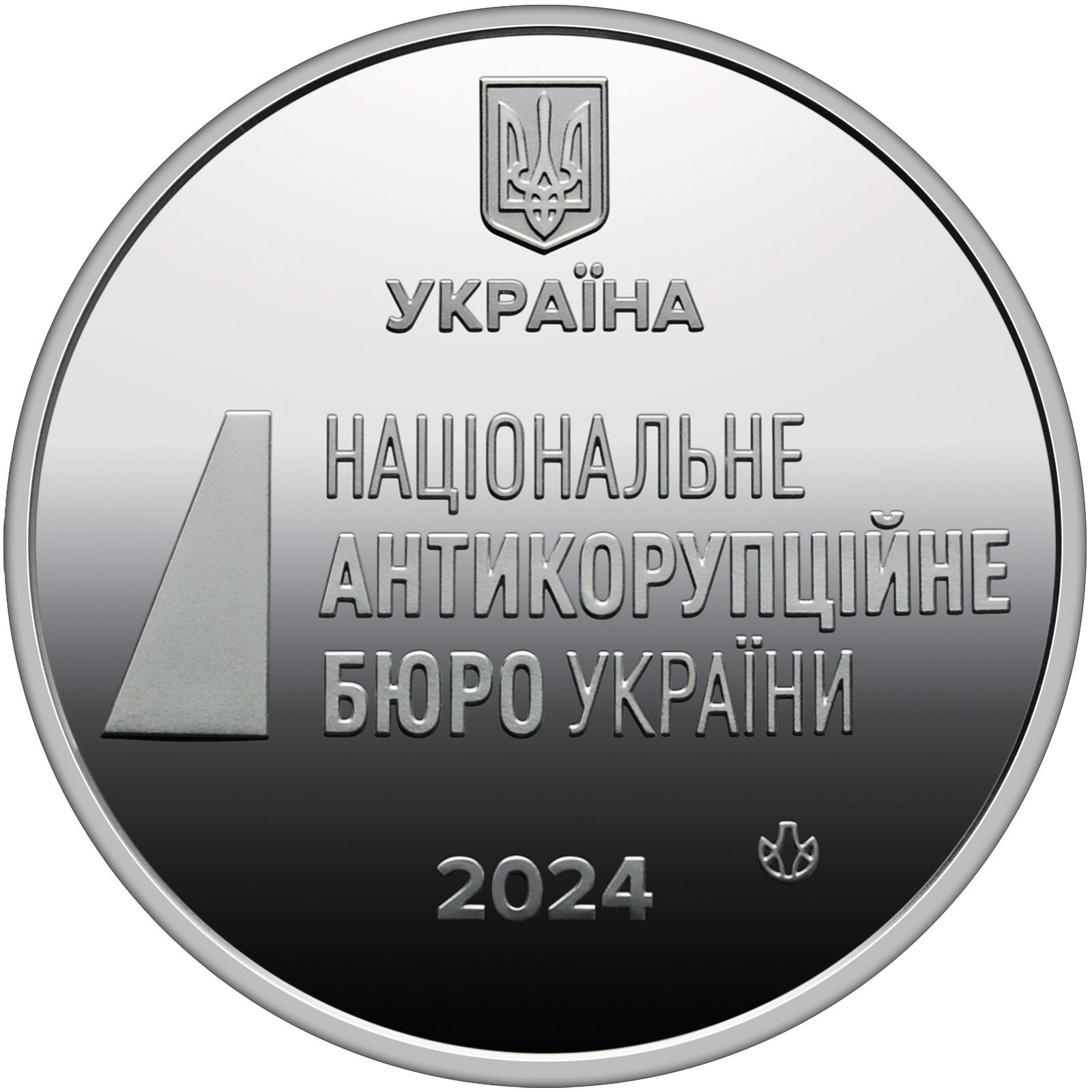 Опис: Логотип Національного антикорупційного бюро України, над яким розміщений малий герб України; під ним — рік випуску медалі — 2024 та знак монетного двору Національного банку України «Банкнотно-монетний двір».