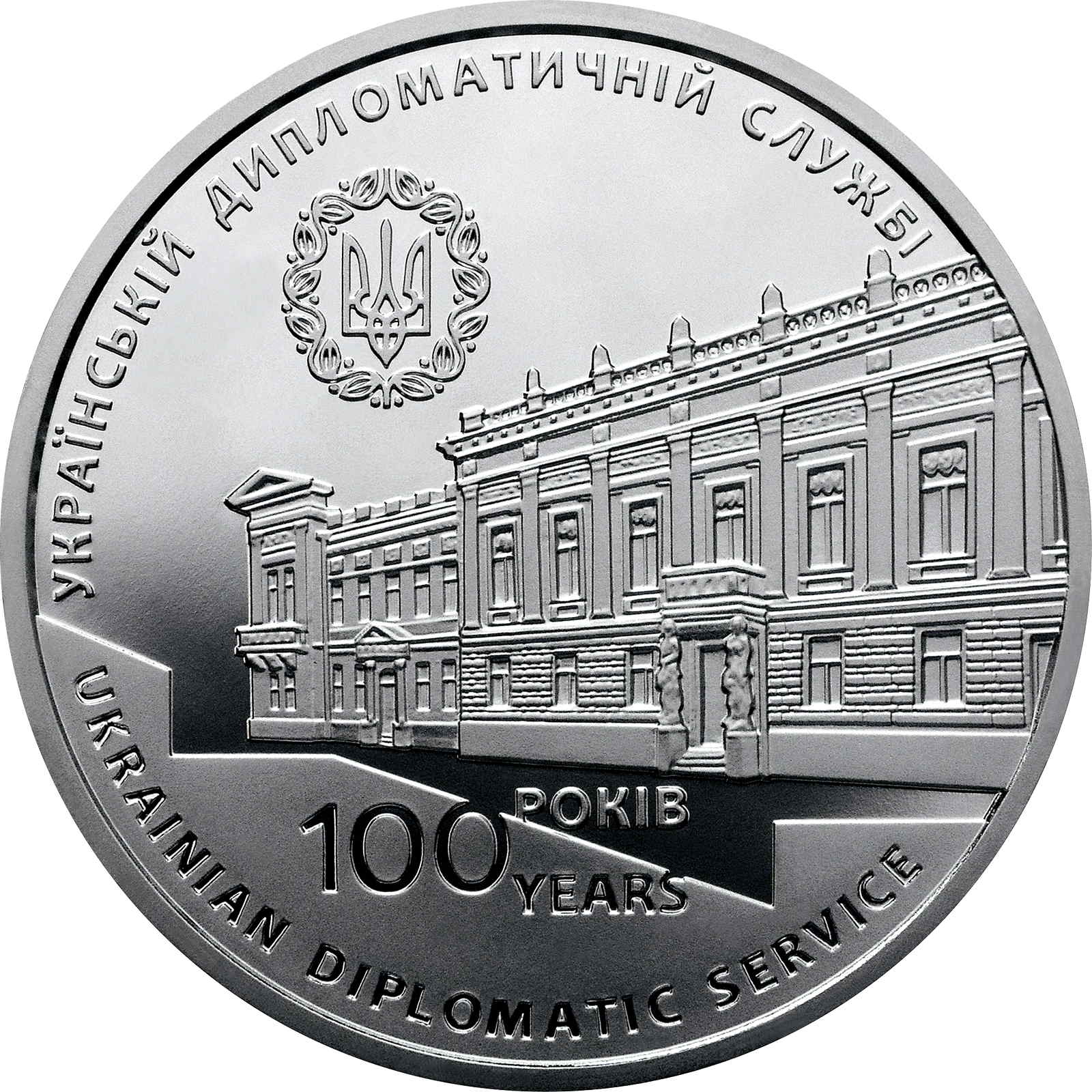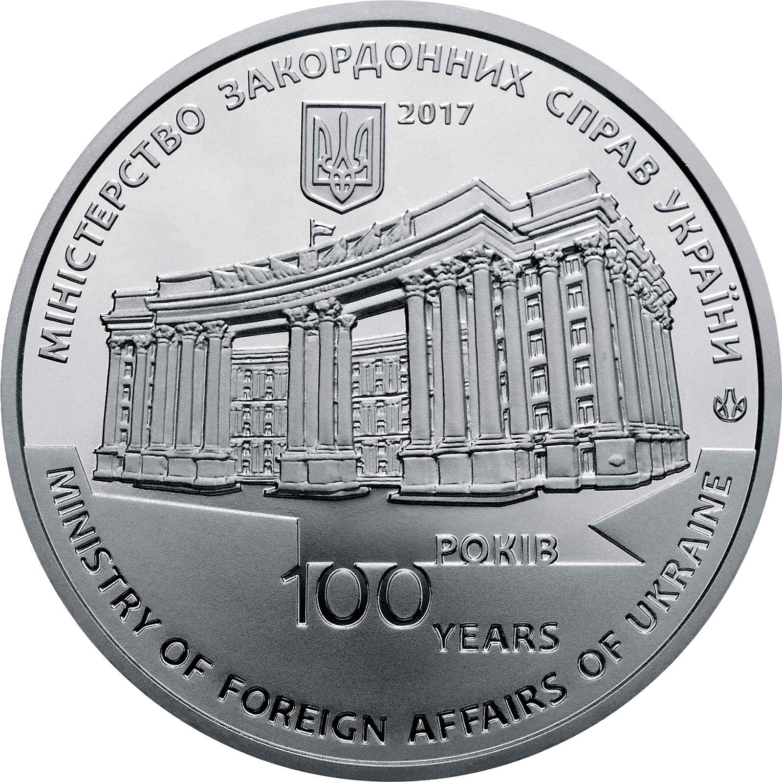 Опис: Зверху зображено малий герб України, праворуч від якого вказано рік випуску — 2017; у центрі, на гладкому тлі, зображено сучасну будівлю Міністерства закордонних справ України, центрального виконавчого органу, відповідального за зовнішню політику країни, та такі написи: 100/РОКІВ/YEARS (під будівлею), МІНІСТЕРСТВО ЗАКОРДОННИХ СПРАВ УКРАЇНИ (напівкругло вище), MINISTRY OF FOREIGN AFFAIRS OF UKRAINE (напівкругло нижче); праворуч – знак монетного двору ПБН «Держдрукарня та монетний двір НБУ».