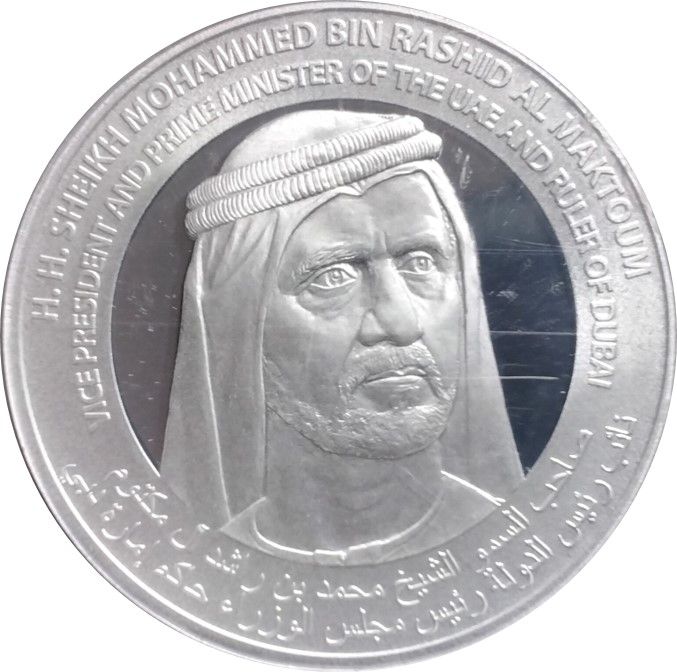 Опис: Голова шейха Мохаммеда бін Рашида Аль Мактума, звернена вправо, з арабськими та англійськими написами, що вказують його ім'я та титули.