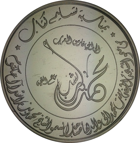 Опис: Бюст шейха Мохаммеда бін Рашида Аль Мактума, звернений праворуч, у колі, а його ім'я арабською та англійською мовами навколо.