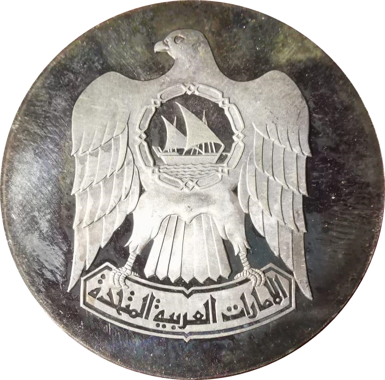 Опис: Стара емблема Об'єднаних Арабських Еміратів, яка використовувалася з 1973 по 2008 рік. Вона складається з сокола Саладіна. Сокіл тримає в лапах диск, на якому зображено 2 дау (арабські вітрильники). Диск оточений ланцюгом. Сокіл тримає в лапах пергамент з назвою федерації, написаною куфічним шрифтом.